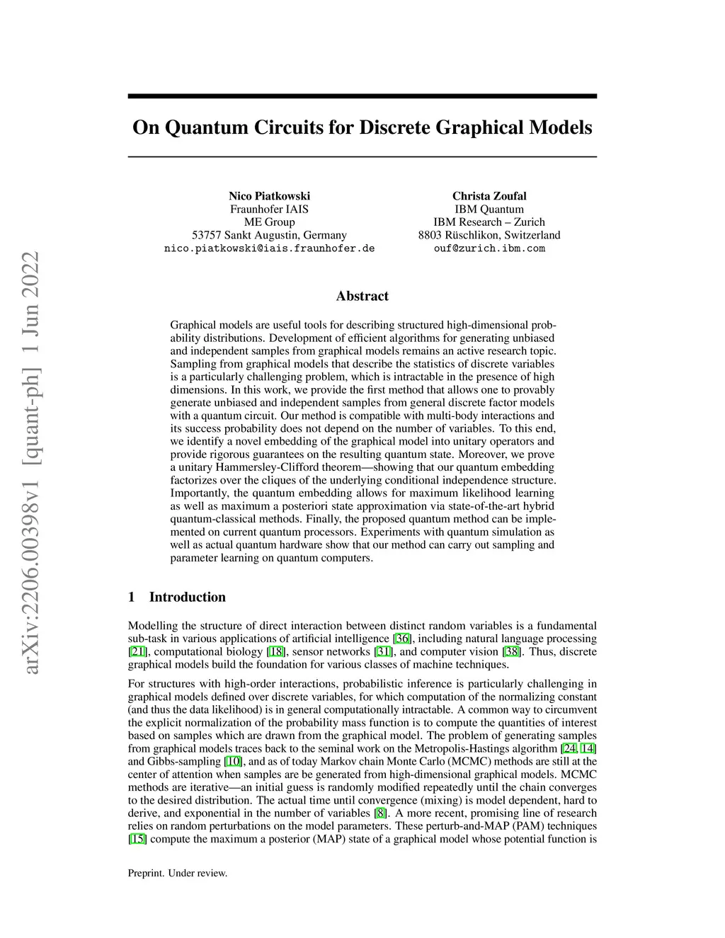 Graphical models are useful tools for describing structured high-dimensional probability distributions. Development of efficient algorithms for generating unbiased and independent samples from graphical models remains an active research topic. Sampling from graphical models that describe the statistics of discrete variables is a particularly challenging problem, which is intractable in the presence of high dimensions. In this work, we provide the first method that allows one to provably generate unbiased and independent samples from general discrete factor models with a quantum circuit. Our method is compatible with multi-body interactions and its success probability does not depend on the number of variables. To this end, we identify a novel embedding of the graphical model into unitary operators and provide rigorous guarantees on the resulting quantum state. Moreover, we prove a unitary Hammersley-Clifford theorem -- showing that our quantum embedding factorizes over the cliques of the underlying conditional independence structure. Importantly, the quantum embedding allows for maximum likelihood learning as well as maximum a posteriori state approximation via state-of-the-art hybrid quantum-classical methods. Finally, the proposed quantum method can be implemented on current quantum processors. Experiments with quantum simulation as well as actual quantum hardware show that our method can carry out sampling and parameter learning on quantum computers.