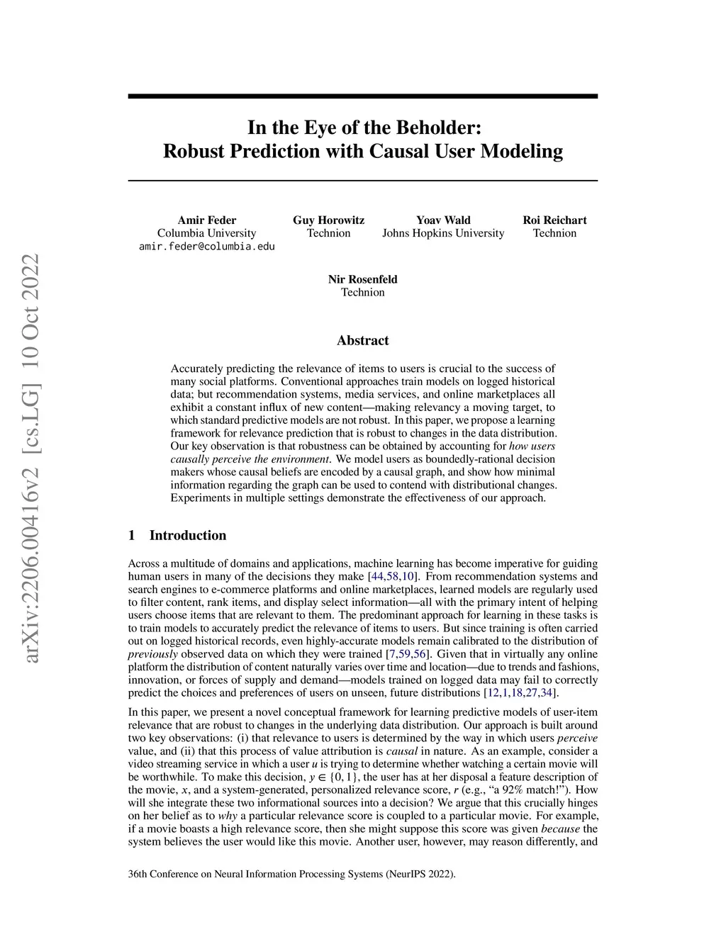 Accurately predicting the relevance of items to users is crucial to the success of many social platforms. Conventional approaches train models on logged historical data; but recommendation systems, media services, and online marketplaces all exhibit a constant influx of new content -- making relevancy a moving target, to which standard predictive models are not robust. In this paper, we propose a learning framework for relevance prediction that is robust to changes in the data distribution. Our key observation is that robustness can be obtained by accounting for how users causally perceive the environment. We model users as boundedly-rational decision makers whose causal beliefs are encoded by a causal graph, and show how minimal information regarding the graph can be used to contend with distributional changes. Experiments in multiple settings demonstrate the effectiveness of our approach.