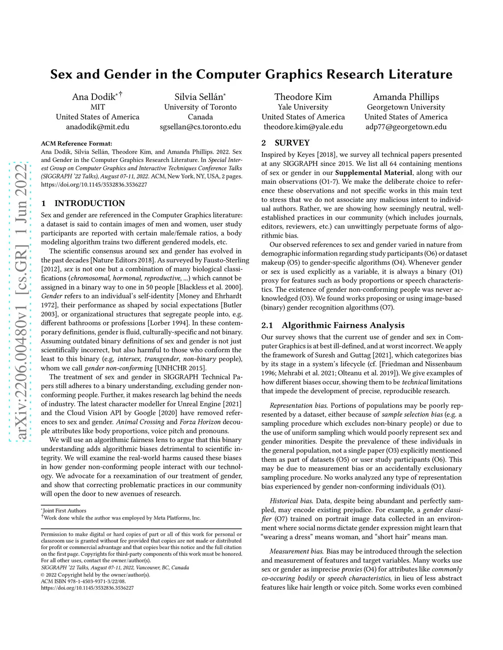 We survey the treatment of sex and gender in the Computer Graphics research literature from an algorithmic fairness perspective. The established practices on the use of gender and sex in our community are scientifically incorrect and constitute a form of algorithmic bias with potential harmful effects. We propose ways of addressing these as technical limitations.