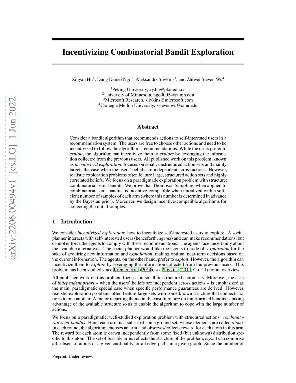 Consider a bandit algorithm that recommends actions to self-interested users in a recommendation system. The users are free to choose other actions and need to be incentivized to follow the algorithm's recommendations. While the users prefer to exploit, the algorithm can incentivize them to explore by leveraging the information collected from the previous users. All published work on this problem, known as incentivized exploration, focuses on small, unstructured action sets and mainly targets the case when the users' beliefs are independent across actions. However, realistic exploration problems often feature large, structured action sets and highly correlated beliefs. We focus on a paradigmatic exploration problem with structure: combinatorial semi-bandits. We prove that Thompson Sampling, when applied to combinatorial semi-bandits, is incentive-compatible when initialized with a sufficient number of samples of each arm (where this number is determined in advance by the Bayesian prior). Moreover, we design incentive-compatible algorithms for collecting the initial samples.