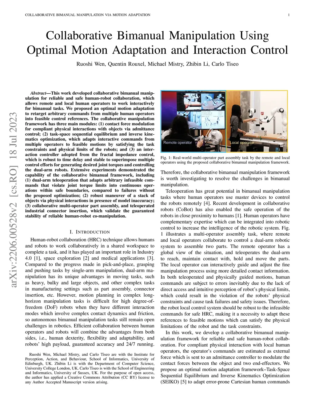 This work developed collaborative bimanual manipulation for reliable and safe human-robot collaboration, which allows remote and local human operators to work interactively for bimanual tasks. We proposed an optimal motion adaptation to retarget arbitrary commands from multiple human operators into feasible control references. The collaborative manipulation framework has three main modules: (1) contact force modulation for compliant physical interactions with objects via admittance control; (2) task-space sequential equilibrium and inverse kinematics optimization, which adapts interactive commands from multiple operators to feasible motions by satisfying the task constraints and physical limits of the robots; and (3) an interaction controller adopted from the fractal impedance control, which is robust to time delay and stable to superimpose multiple control efforts for generating desired joint torques and controlling the dual-arm robots. Extensive experiments demonstrated the capability of the collaborative bimanual framework, including (1) dual-arm teleoperation that adapts arbitrary infeasible commands that violate joint torque limits into continuous operations within safe boundaries, compared to failures without the proposed optimization; (2) robust maneuver of a stack of objects via physical interactions in presence of model inaccuracy; (3) collaborative multi-operator part assembly, and teleoperated industrial connector insertion, which validate the guaranteed stability of reliable human-robot co-manipulation.