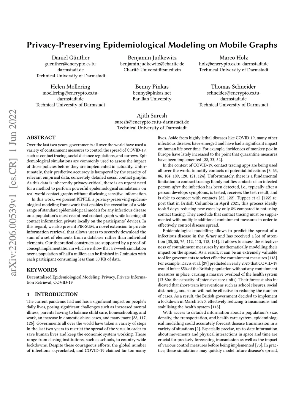 Over the last two years, governments all over the world have used a variety of containment measures to control the spread of COVID-19, such as contact tracing, social distance regulations, and curfews. Epidemiological simulations are commonly used to assess the impact of those policies before they are implemented in actuality. Unfortunately, their predictive accuracy is hampered by the scarcity of relevant empirical data, concretely detailed social contact graphs. As this data is inherently privacy-critical, there is an urgent need for a method to perform powerful epidemiological simulations on real-world contact graphs without disclosing sensitive information. In this work, we present RIPPLE, a privacy-preserving epidemiological modeling framework that enables the execution of a wide range of standard epidemiological models for any infectious disease on a population's most recent real contact graph while keeping all contact information private locally on the participants' devices. In this regard, we also present PIR-SUM, a novel extension to private information retrieval that allows users to securely download the sum of a set of elements from a database rather than individual elements. Our theoretical constructs are supported by a proof-of-concept implementation in which we show that a 2-week simulation over a population of half a million can be finished in 7 minutes with each participant consuming less than 50 KB of data.