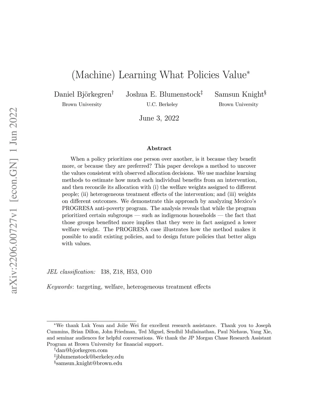 When a policy prioritizes one person over another, is it because they benefit more, or because they are preferred? This paper develops a method to uncover the values consistent with observed allocation decisions. We use machine learning methods to estimate how much each individual benefits from an intervention, and then reconcile its allocation with (i) the welfare weights assigned to different people; (ii) heterogeneous treatment effects of the intervention; and (iii) weights on different outcomes. We demonstrate this approach by analyzing Mexico's PROGRESA anti-poverty program. The analysis reveals that while the program prioritized certain subgroups -- such as indigenous households -- the fact that those groups benefited more implies that they were in fact assigned a lower welfare weight. The PROGRESA case illustrates how the method makes it possible to audit existing policies, and to design future policies that better align with values.