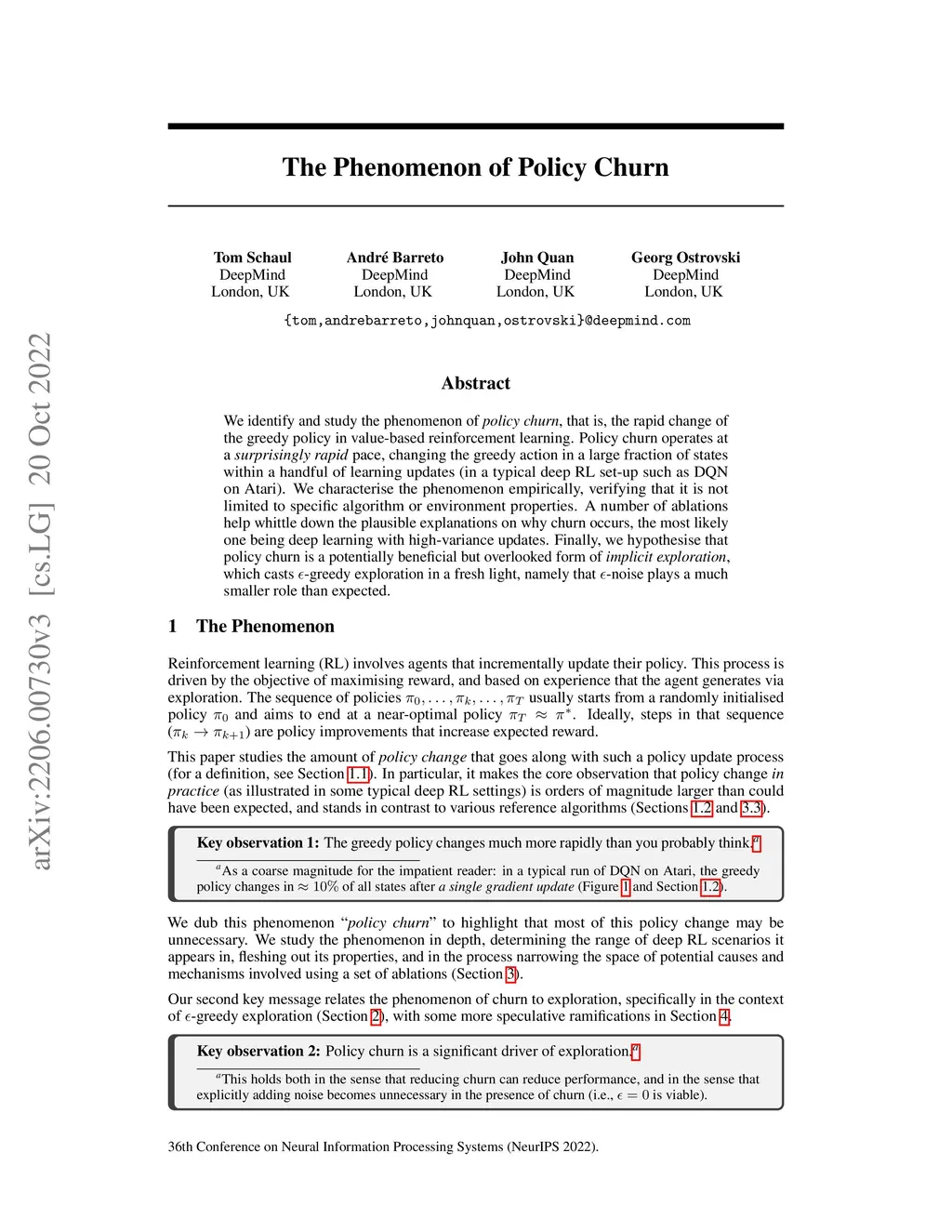 We identify and study the phenomenon of policy churn, that is, the rapid change of the greedy policy in value-based reinforcement learning. Policy churn operates at a surprisingly rapid pace, changing the greedy action in a large fraction of states within a handful of learning updates (in a typical deep RL set-up such as DQN on Atari). We characterise the phenomenon empirically, verifying that it is not limited to specific algorithm or environment properties. A number of ablations help whittle down the plausible explanations on why churn occurs to just a handful, all related to deep learning. Finally, we hypothesise that policy churn is a beneficial but overlooked form of implicit exploration that casts ϵ\epsilon-greedy exploration in a fresh light, namely that ϵ\epsilon-noise plays a much smaller role than expected.