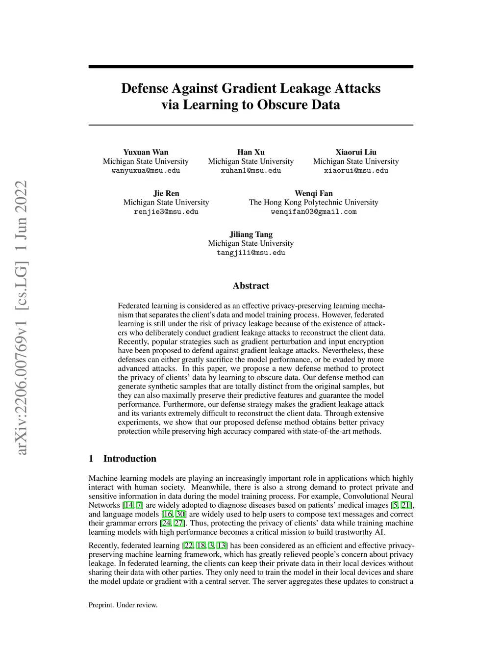 Federated learning is considered as an effective privacy-preserving learning mechanism that separates the client's data and model training process. However, federated learning is still under the risk of privacy leakage because of the existence of attackers who deliberately conduct gradient leakage attacks to reconstruct the client data. Recently, popular strategies such as gradient perturbation methods and input encryption methods have been proposed to defend against gradient leakage attacks. Nevertheless, these defenses can either greatly sacrifice the model performance, or be evaded by more advanced attacks. In this paper, we propose a new defense method to protect the privacy of clients' data by learning to obscure data. Our defense method can generate synthetic samples that are totally distinct from the original samples, but they can also maximally preserve their predictive features and guarantee the model performance. Furthermore, our defense strategy makes the gradient leakage attack and its variants extremely difficult to reconstruct the client data. Through extensive experiments, we show that our proposed defense method obtains better privacy protection while preserving high accuracy compared with state-of-the-art methods.