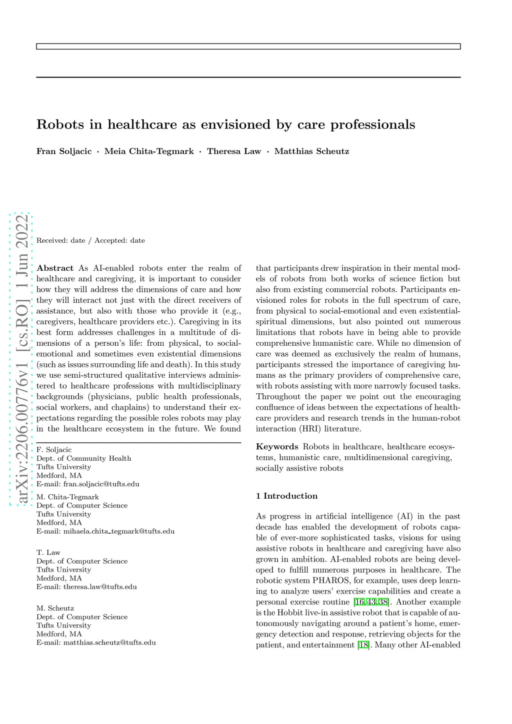 As AI-enabled robots enter the realm of healthcare and caregiving, it is important to consider how they will address the dimensions of care and how they will interact not just with the direct receivers of assistance, but also with those who provide it (e.g., caregivers, healthcare providers etc.). Caregiving in its best form addresses challenges in a multitude of dimensions of a person's life: from physical, to social-emotional and sometimes even existential dimensions (such as issues surrounding life and death). In this study we use semi-structured qualitative interviews administered to healthcare professions with multidisciplinary backgrounds (physicians, public health professionals, social workers, and chaplains) to understand their expectations regarding the possible roles robots may play in the healthcare ecosystem in the future. We found that participants drew inspiration in their mental models of robots from both works of science fiction but also from existing commercial robots. Participants envisioned roles for robots in the full spectrum of care, from physical to social-emotional and even existential-spiritual dimensions, but also pointed out numerous limitations that robots have in being able to provide comprehensive humanistic care. While no dimension of care was deemed as exclusively the realm of humans, participants stressed the importance of caregiving humans as the primary providers of comprehensive care, with robots assisting with more narrowly focused tasks. Throughout the paper we point out the encouraging confluence of ideas between the expectations of healthcare providers and research trends in the human-robot interaction (HRI) literature.