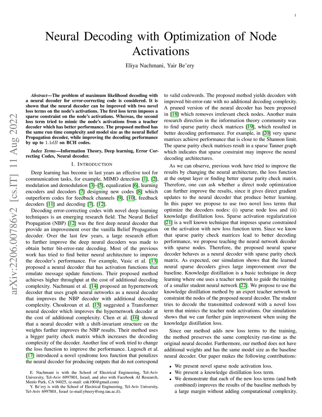 The problem of maximum likelihood decoding with a neural decoder for error-correcting code is considered. It is shown that the neural decoder can be improved with two novel loss terms on the node's activations. The first loss term imposes a sparse constraint on the node's activations. Whereas, the second loss term tried to mimic the node's activations from a teacher decoder which has better performance. The proposed method has the same run time complexity and model size as the neural Belief Propagation decoder, while improving the decoding performance by up to on BCH codes.