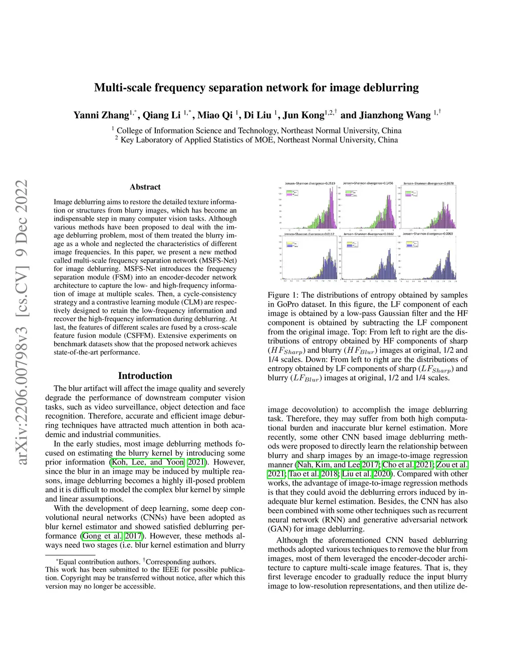 Image deblurring aims to restore the detailed texture information or structures from blurry images, which has become an indispensable step in many computer vision tasks. Although various methods have been proposed to deal with the image deblurring problem, most of them treated the blurry image as a whole and neglected the characteristics of different image frequencies. In this paper, we present a new method called multi-scale frequency separation network (MSFS-Net) for image deblurring. MSFS-Net introduces the frequency separation module (FSM) into an encoder-decoder network architecture to capture the low- and high-frequency information of image at multiple scales. Then, a cycle-consistency strategy and a contrastive learning module (CLM) are respectively designed to retain the low-frequency information and recover the high-frequency information during deblurring. At last, the features of different scales are fused by a cross-scale feature fusion module (CSFFM). Extensive experiments on benchmark datasets show that the proposed network achieves state-of-the-art performance.