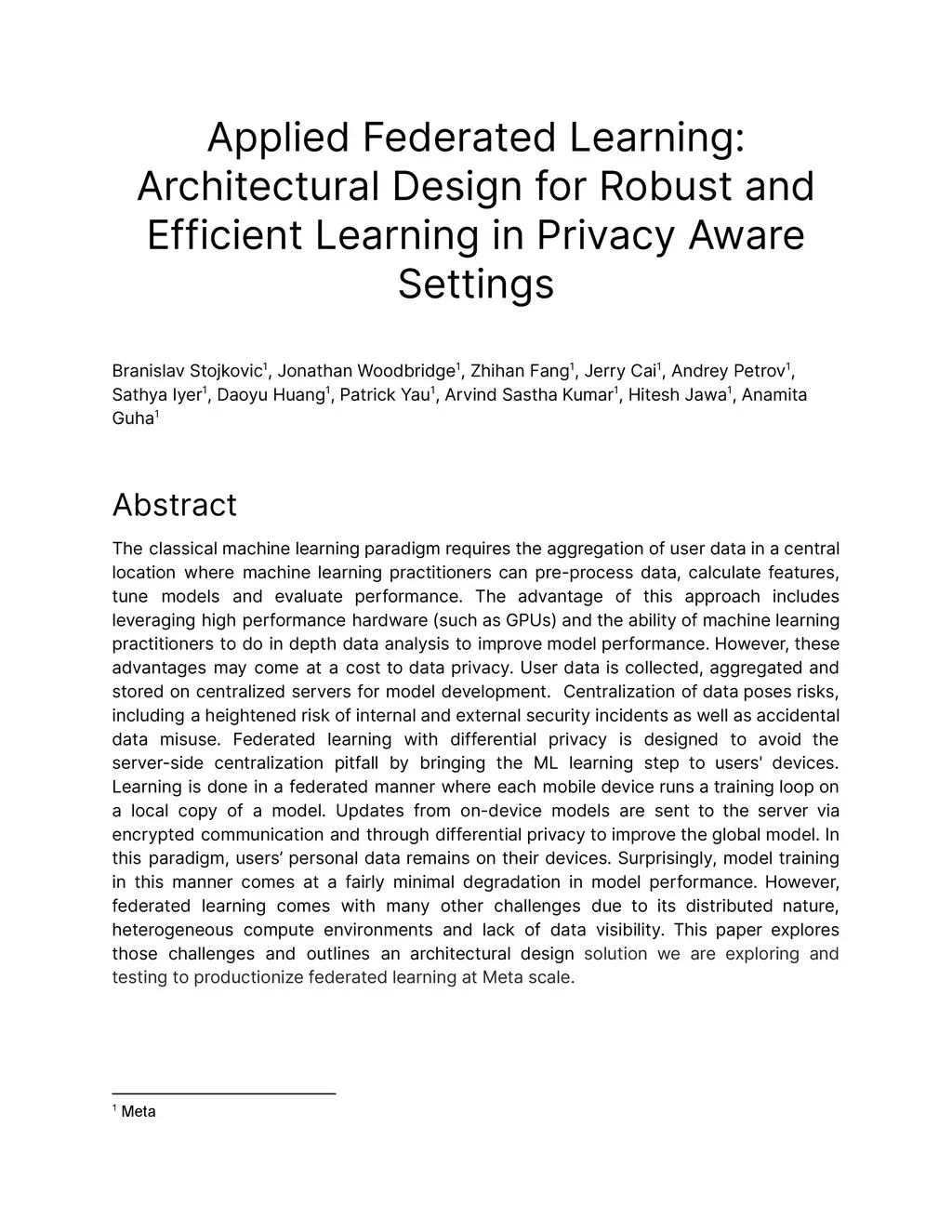 The classical machine learning paradigm requires the aggregation of user data in a central location where machine learning practitioners can preprocess data, calculate features, tune models and evaluate performance. The advantage of this approach includes leveraging high performance hardware (such as GPUs) and the ability of machine learning practitioners to do in depth data analysis to improve model performance. However, these advantages may come at a cost to data privacy. User data is collected, aggregated, and stored on centralized servers for model development. Centralization of data poses risks, including a heightened risk of internal and external security incidents as well as accidental data misuse. Federated learning with differential privacy is designed to avoid the server-side centralization pitfall by bringing the ML learning step to users' devices. Learning is done in a federated manner where each mobile device runs a training loop on a local copy of a model. Updates from on-device models are sent to the server via encrypted communication and through differential privacy to improve the global model. In this paradigm, users' personal data remains on their devices. Surprisingly, model training in this manner comes at a fairly minimal degradation in model performance. However, federated learning comes with many other challenges due to its distributed nature, heterogeneous compute environments and lack of data visibility. This paper explores those challenges and outlines an architectural design solution we are exploring and testing to productionize federated learning at Meta scale.