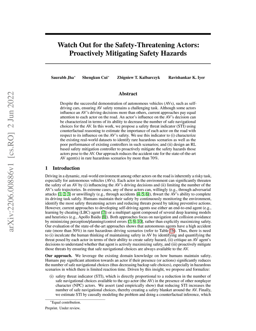 Despite the successful demonstration of autonomous vehicles (AVs), such as self-driving cars, ensuring AV safety remains a challenging task. Although some actors influence an AV's driving decisions more than others, current approaches pay equal attention to each actor on the road. An actor's influence on the AV's decision can be characterized in terms of its ability to decrease the number of safe navigational choices for the AV. In this work, we propose a safety threat indicator (STI) using counterfactual reasoning to estimate the importance of each actor on the road with respect to its influence on the AV's safety. We use this indicator to (i) characterize the existing real-world datasets to identify rare hazardous scenarios as well as the poor performance of existing controllers in such scenarios; and (ii) design an RL based safety mitigation controller to proactively mitigate the safety hazards those actors pose to the AV. Our approach reduces the accident rate for the state-of-the-art AV agent(s) in rare hazardous scenarios by more than 70%.