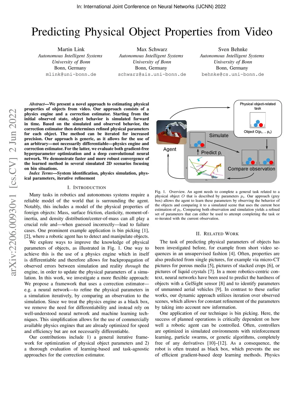 We present a novel approach to estimating physical properties of objects from video. Our approach consists of a physics engine and a correction estimator. Starting from the initial observed state, object behavior is simulated forward in time. Based on the simulated and observed behavior, the correction estimator then determines refined physical parameters for each object. The method can be iterated for increased precision. Our approach is generic, as it allows for the use of an arbitrary - not necessarily differentiable - physics engine and correction estimator. For the latter, we evaluate both gradient-free hyperparameter optimization and a deep convolutional neural network. We demonstrate faster and more robust convergence of the learned method in several simulated 2D scenarios focusing on bin situations.