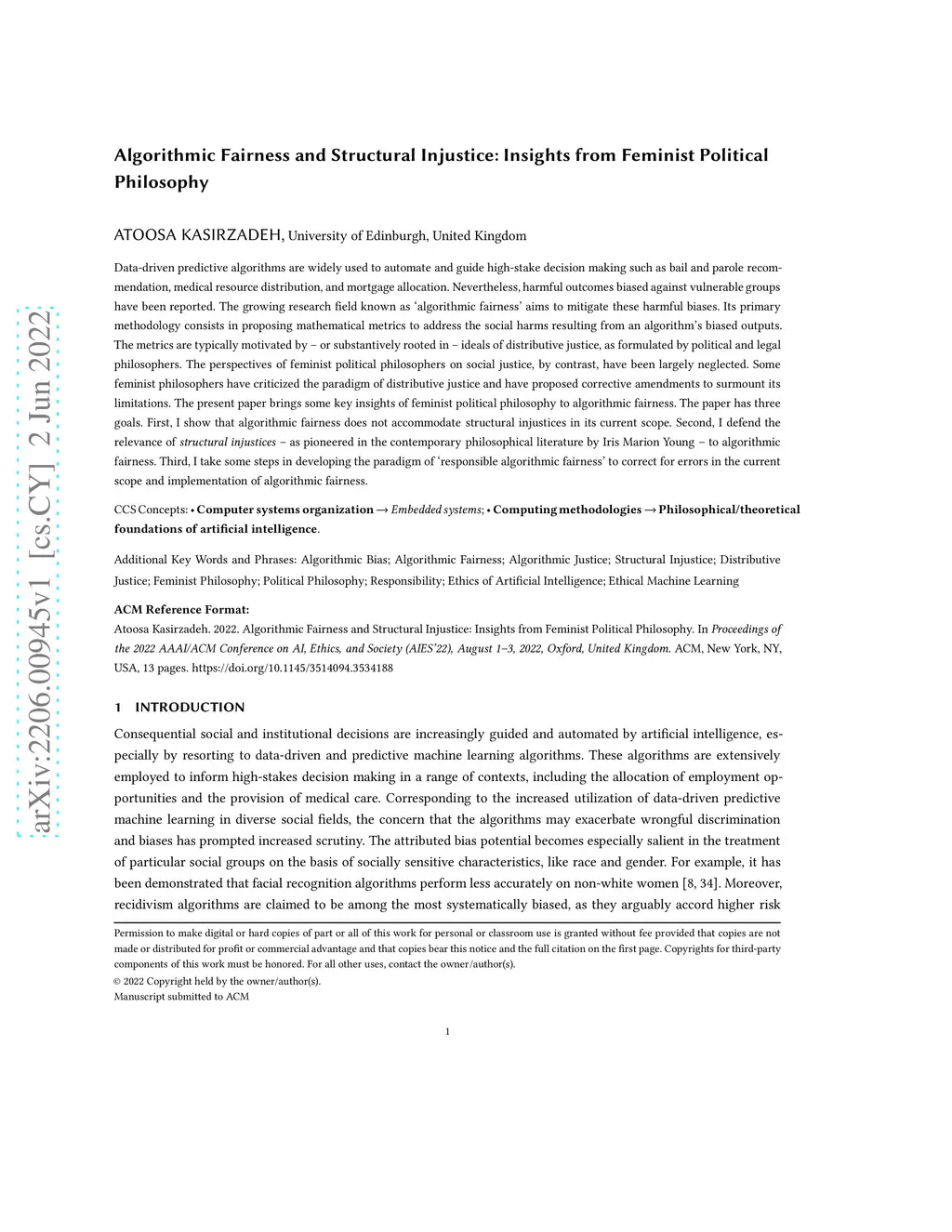 Data-driven predictive algorithms are widely used to automate and guide high-stake decision making such as bail and parole recommendation, medical resource distribution, and mortgage allocation. Nevertheless, harmful outcomes biased against vulnerable groups have been reported. The growing research field known as álgorithmic fairness' aims to mitigate these harmful biases. Its primary methodology consists in proposing mathematical metrics to address the social harms resulting from an algorithm's biased outputs. The metrics are typically motivated by -- or substantively rooted in -- ideals of distributive justice, as formulated by political and legal philosophers. The perspectives of feminist political philosophers on social justice, by contrast, have been largely neglected. Some feminist philosophers have criticized the paradigm of distributive justice and have proposed corrective amendments to surmount its limitations. The present paper brings some key insights of feminist political philosophy to algorithmic fairness. The paper has three goals. First, I show that algorithmic fairness does not accommodate structural injustices in its current scope. Second, I defend the relevance of structural injustices -- as pioneered in the contemporary philosophical literature by Iris Marion Young -- to algorithmic fairness. Third, I take some steps in developing the paradigm of 'responsible algorithmic fairness' to correct for errors in the current scope and implementation of algorithmic fairness.