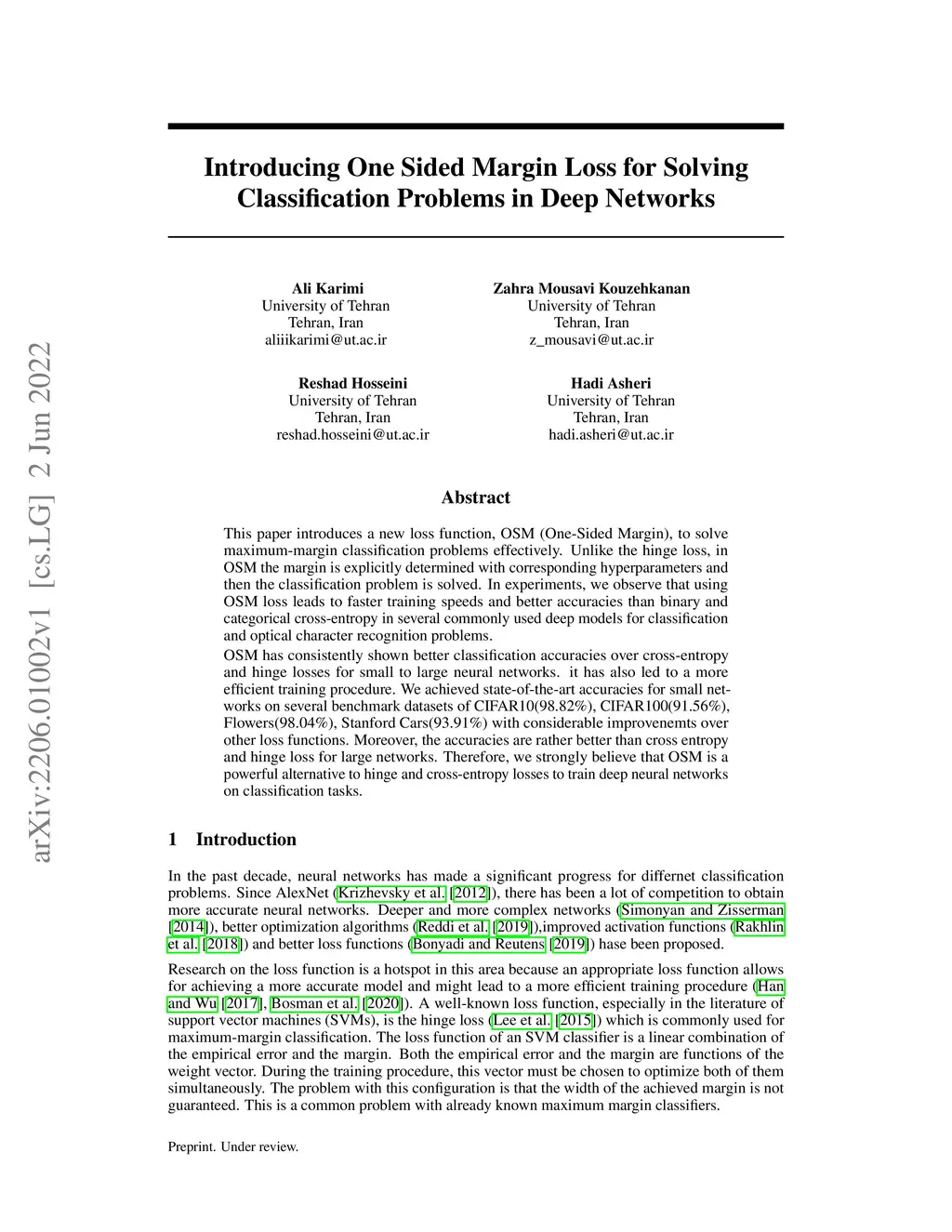 Introducing One Sided Margin Loss for Solving Classification Problems in