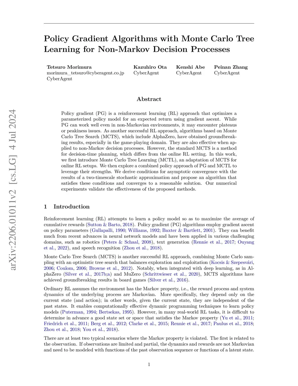 Policy Gradient Algorithms with Monte Carlo Tree Learning for Non-Markov