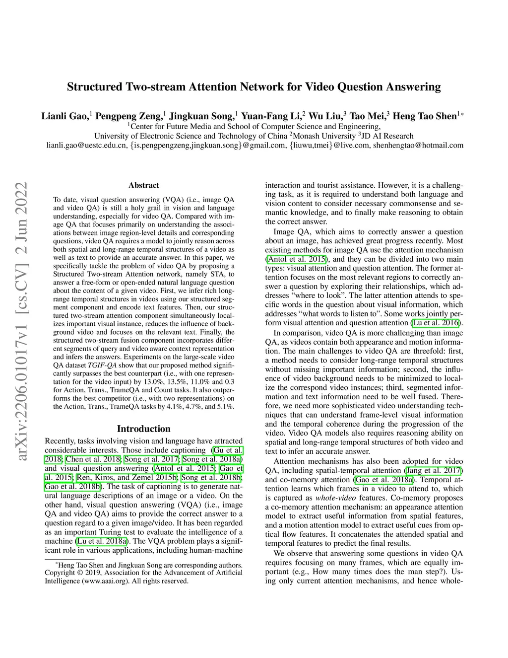 To date, visual question answering (VQA) (i.e., image QA and video QA) is still a holy grail in vision and language understanding, especially for video QA. Compared with image QA that focuses primarily on understanding the associations between image region-level details and corresponding questions, video QA requires a model to jointly reason across both spatial and long-range temporal structures of a video as well as text to provide an accurate answer. In this paper, we specifically tackle the problem of video QA by proposing a Structured Two-stream Attention network, namely STA, to answer a free-form or open-ended natural language question about the content of a given video. First, we infer rich long-range temporal structures in videos using our structured segment component and encode text features. Then, our structured two-stream attention component simultaneously localizes important visual instance, reduces the influence of background video and focuses on the relevant text. Finally, the structured two-stream fusion component incorporates different segments of query and video aware context representation and infers the answers. Experiments on the large-scale video QA dataset \textit{TGIF-QA} show that our proposed method significantly surpasses the best counterpart (i.e., with one representation for the video input) by 13.0%, 13.5%, 11.0% and 0.3 for Action, Trans., TrameQA and Count tasks. It also outperforms the best competitor (i.e., with two representations) on the Action, Trans., TrameQA tasks by 4.1%, 4.7%, and 5.1%.