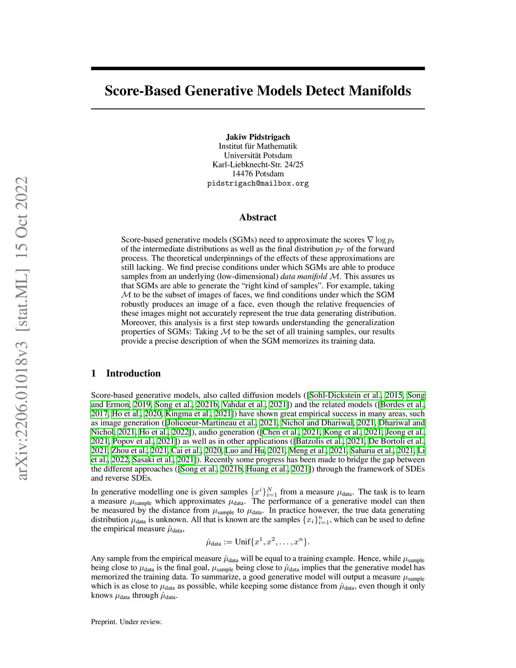 Score-based generative models (SGMs) need to approximate the scores of the intermediate distributions as well as the final distribution of the forward process. The theoretical underpinnings of the effects of these approximations are still lacking. We find precise conditions under which SGMs are able to produce samples from an underlying (low-dimensional) data manifold . This assures us that SGMs are able to generate the "right kind of samples". For example, taking to be the subset of images of faces, we find conditions under which the SGM robustly produces an image of a face, even though the relative frequencies of these images might not accurately represent the true data generating distribution. Moreover, this analysis is a first step towards understanding the generalization properties of SGMs: Taking to be the set of all training samples, our results provide a precise description of when the SGM memorizes its training data.