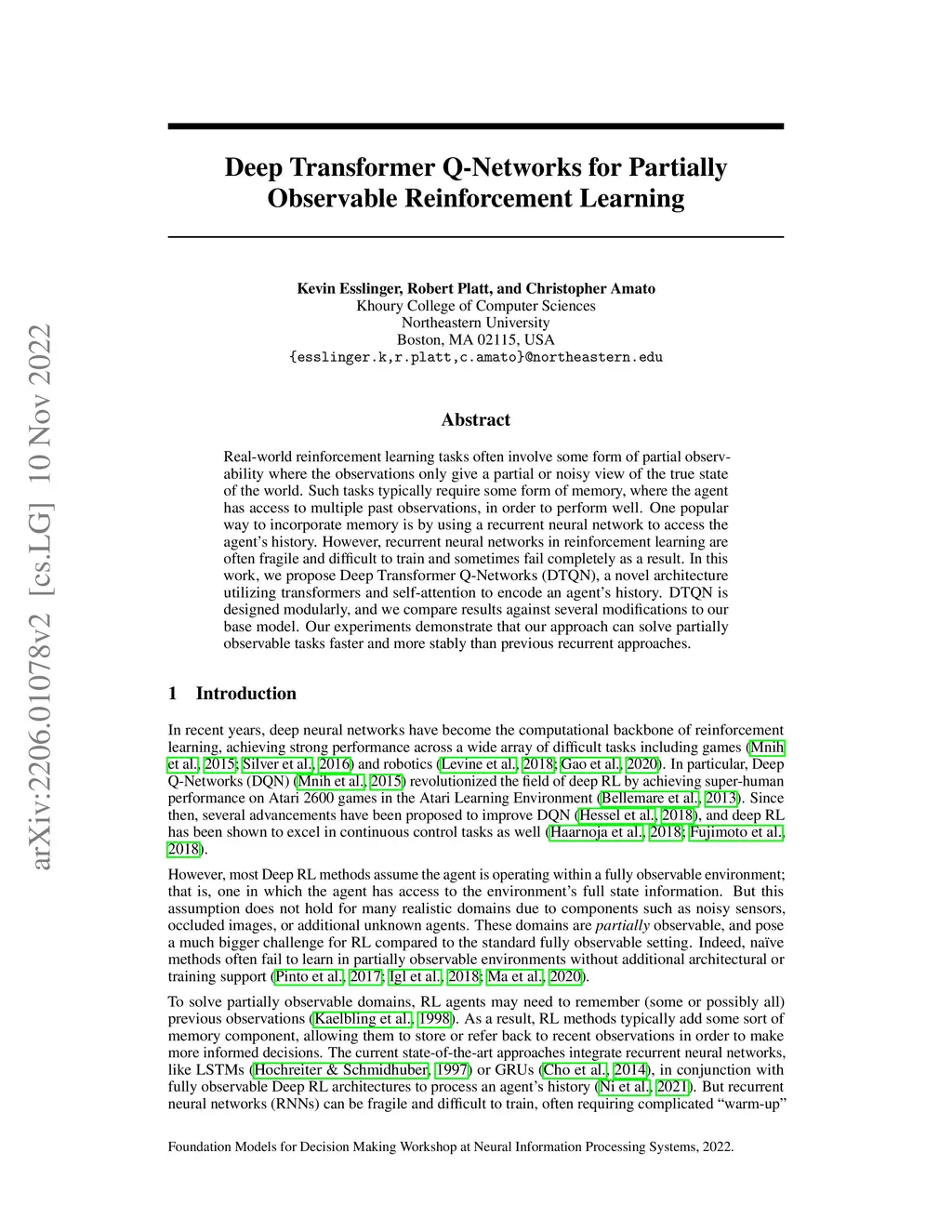 Deep Transformer Q-Networks for Partially Observable Reinforcement