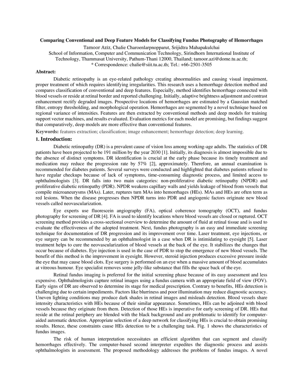 Diabetic retinopathy is an eye-related pathology creating abnormalities and causing visual impairment, proper treatment of which requires identifying irregularities. This research uses a hemorrhage detection method and compares classification of conventional and deep features. Especially, method identifies hemorrhage connected with blood vessels or reside at retinal border and reported challenging. Initially, adaptive brightness adjustment and contrast enhancement rectify degraded images. Prospective locations of hemorrhages are estimated by a Gaussian matched filter, entropy thresholding, and morphological operation. Hemorrhages are segmented by a novel technique based on regional variance of intensities. Features are then extracted by conventional methods and deep models for training support vector machines, and results evaluated. Evaluation metrics for each model are promising, but findings suggest that comparatively, deep models are more effective than conventional features.