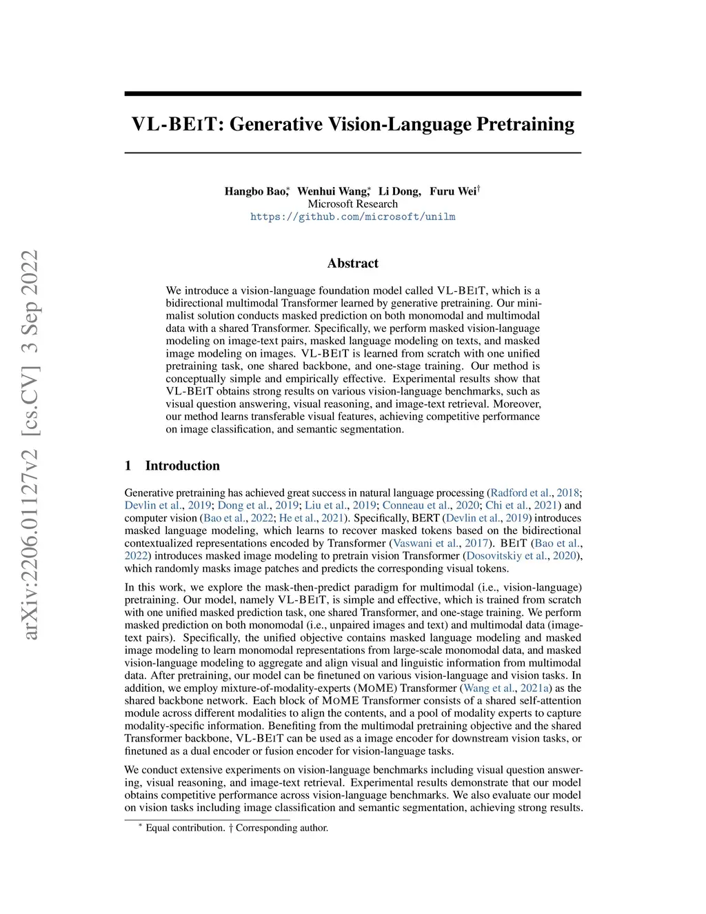 We introduce a vision-language foundation model called VL-BEiT, which is a bidirectional multimodal Transformer learned by generative pretraining. Our minimalist solution conducts masked prediction on both monomodal and multimodal data with a shared Transformer. Specifically, we perform masked vision-language modeling on image-text pairs, masked language modeling on texts, and masked image modeling on images. VL-BEiT is learned from scratch with one unified pretraining task, one shared backbone, and one-stage training. Our method is conceptually simple and empirically effective. Experimental results show that VL-BEiT obtains strong results on various vision-language benchmarks, such as visual question answering, visual reasoning, and image-text retrieval. Moreover, our method learns transferable visual features, achieving competitive performance on image classification, and semantic segmentation.