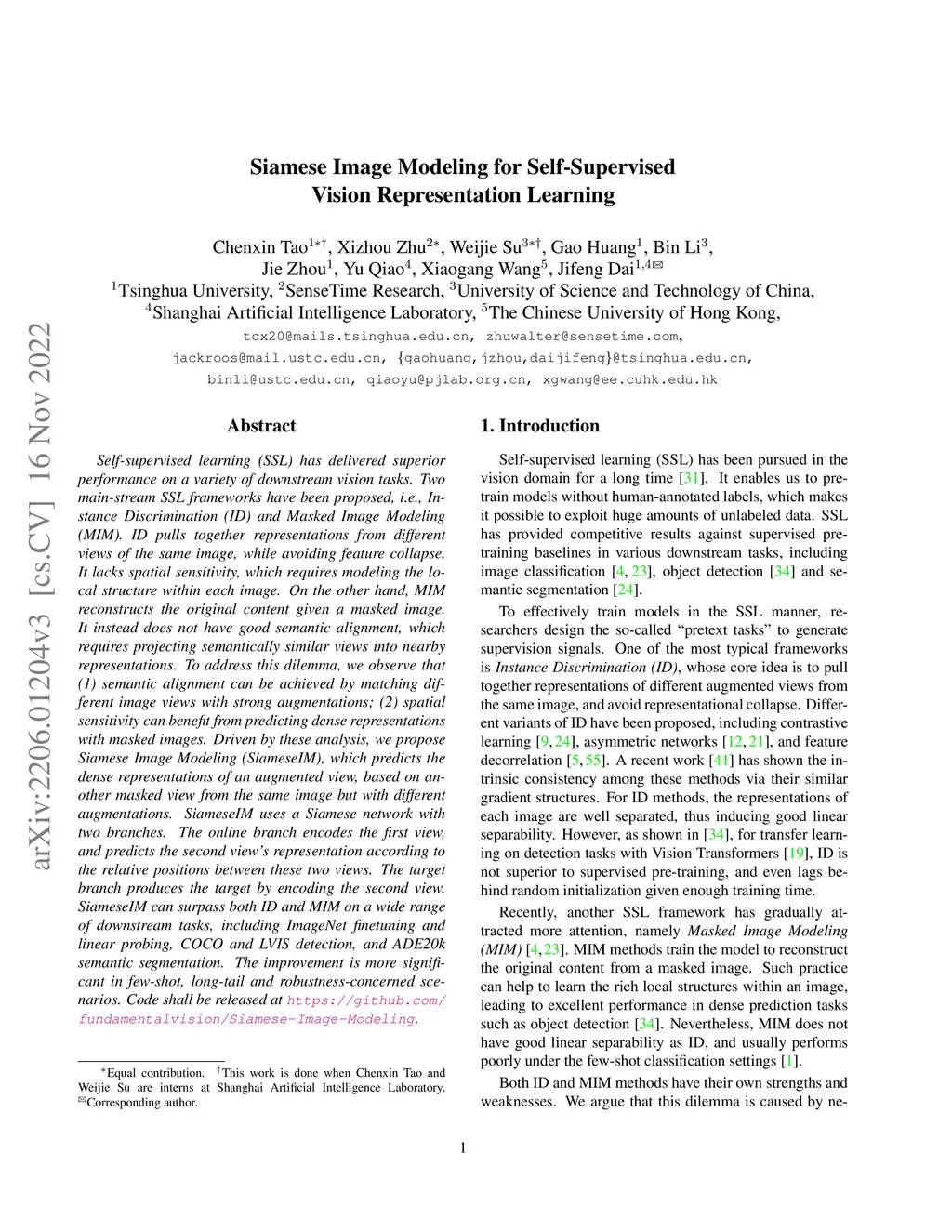 Self-supervised learning (SSL) has delivered superior performance on a variety of downstream vision tasks. Two main-stream SSL frameworks have been proposed, i.e., Instance Discrimination (ID) and Masked Image Modeling (MIM). ID pulls together representations from different views of the same image, while avoiding feature collapse. It lacks spatial sensitivity, which requires modeling the local structure within each image. On the other hand, MIM reconstructs the original content given a masked image. It instead does not have good semantic alignment, which requires projecting semantically similar views into nearby representations. To address this dilemma, we observe that (1) semantic alignment can be achieved by matching different image views with strong augmentations; (2) spatial sensitivity can benefit from predicting dense representations with masked images. Driven by these analysis, we propose Siamese Image Modeling (SiameseIM), which predicts the dense representations of an augmented view, based on another masked view from the same image but with different augmentations. SiameseIM uses a Siamese network with two branches. The online branch encodes the first view, and predicts the second view's representation according to the relative positions between these two views. The target branch produces the target by encoding the second view. SiameseIM can surpass both ID and MIM on a wide range of downstream tasks, including ImageNet finetuning and linear probing, COCO and LVIS detection, and ADE20k semantic segmentation. The improvement is more significant in few-shot, long-tail and robustness-concerned scenarios. Code shall be released at https://github.com/fundamentalvision/Siamese-Image-Modeling.