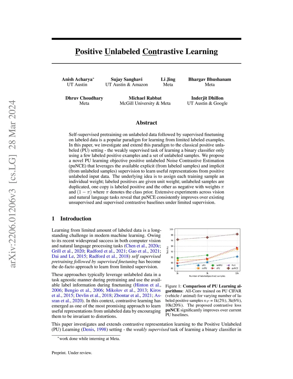 Self-supervised pretraining on unlabeled data followed by supervised fine-tuning on labeled data is a popular paradigm for learning from limited labeled examples. We extend this paradigm to the classical positive unlabeled (PU) setting, where the task is to learn a binary classifier given only a few labeled positive samples, and (often) a large amount of unlabeled samples (which could be positive or negative). We first propose a simple extension of standard infoNCE family of contrastive losses, to the PU setting; and show that this learns superior representations, as compared to existing unsupervised and supervised approaches. We then develop a simple methodology to pseudo-label the unlabeled samples using a new PU-specific clustering scheme; these pseudo-labels can then be used to train the final (positive vs. negative) classifier. Our method handily outperforms state-of-the-art PU methods over several standard PU benchmark datasets, while not requiring a-priori knowledge of any class prior (which is a common assumption in other PU methods). We also provide a simple theoretical analysis that motivates our methods.