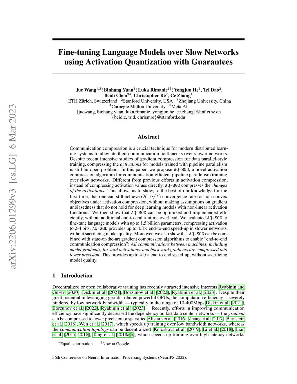 Communication compression is a crucial technique for modern distributed learning systems to alleviate their communication bottlenecks over slower networks. Despite recent intensive studies of gradient compression for data parallel-style training, compressing the activations for models trained with pipeline parallelism is still an open problem. In this paper, we propose AC-SGD, a novel activation compression algorithm for communication-efficient pipeline parallelism training over slow networks. Different from previous efforts in activation compression, instead of compressing activation values directly, AC-SGD compresses the changes of the activations. This allows us to show, to the best of our knowledge for the first time, that one can still achieve convergence rate for non-convex objectives under activation compression, without making assumptions on gradient unbiasedness that do not hold for deep learning models with non-linear activation functions.We then show that AC-SGD can be optimized and implemented efficiently, without additional end-to-end runtime overhead.We evaluated AC-SGD to fine-tune language models with up to 1.5 billion parameters, compressing activations to 2-4 bits.AC-SGD provides up to 4.3X end-to-end speed-up in slower networks, without sacrificing model quality. Moreover, we also show that AC-SGD can be combined with state-of-the-art gradient compression algorithms to enable "end-to-end communication compression: All communications between machines, including model gradients, forward activations, and backward gradients are compressed into lower precision.This provides up to 4.9X end-to-end speed-up, without sacrificing model quality.