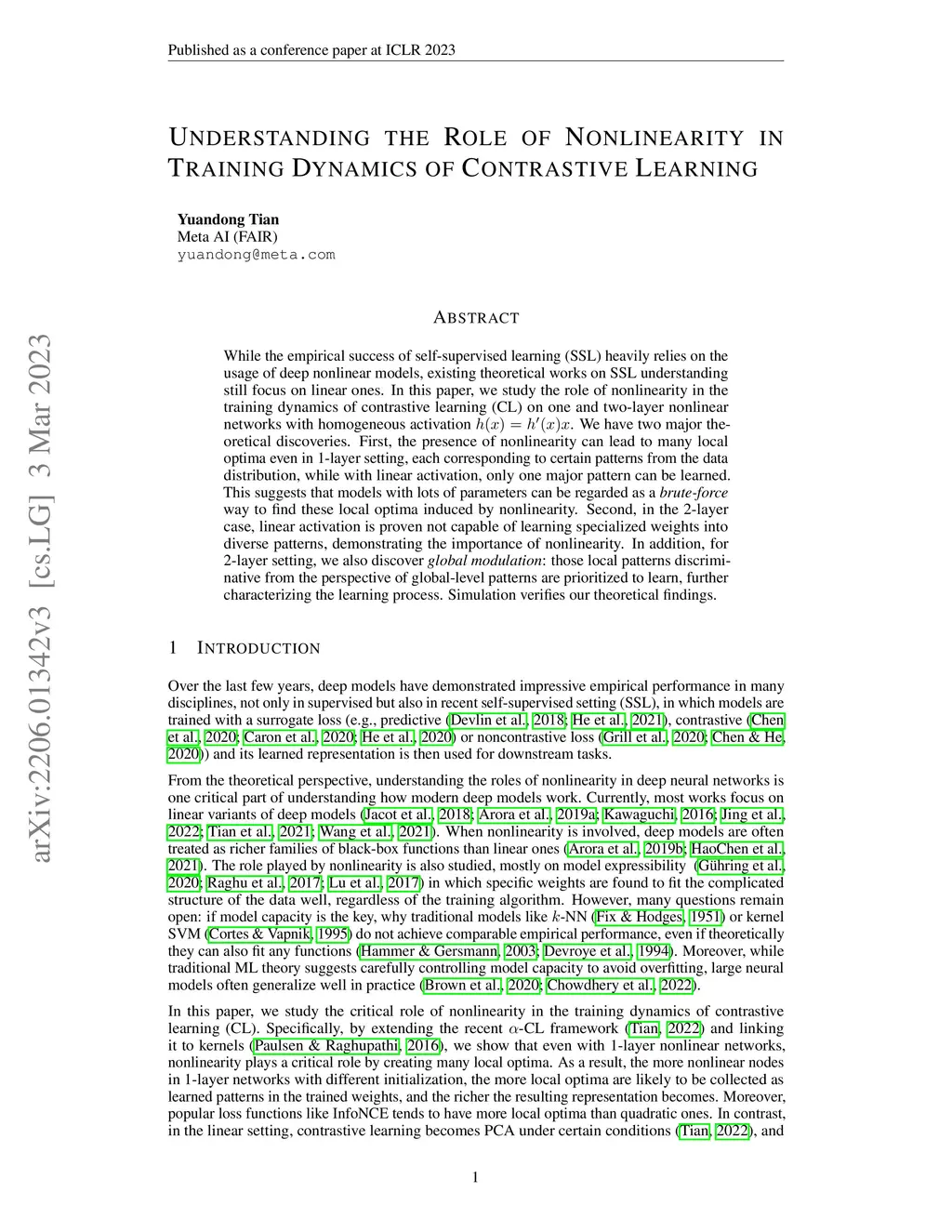 While the empirical success of self-supervised learning (SSL) heavily relies on the usage of deep nonlinear models, existing theoretical works on SSL understanding still focus on linear ones. In this paper, we study the role of nonlinearity in the training dynamics of contrastive learning (CL) on one and two-layer nonlinear networks with homogeneous activation . We have two major theoretical discoveries. First, the presence of nonlinearity can lead to many local optima even in 1-layer setting, each corresponding to certain patterns from the data distribution, while with linear activation, only one major pattern can be learned. This suggests that models with lots of parameters can be regarded as a \emph{brute-force} way to find these local optima induced by nonlinearity. Second, in the 2-layer case, linear activation is proven not capable of learning specialized weights into diverse patterns, demonstrating the importance of nonlinearity. In addition, for 2-layer setting, we also discover \emph{global modulation}: those local patterns discriminative from the perspective of global-level patterns are prioritized to learn, further characterizing the learning process. Simulation verifies our theoretical findings.