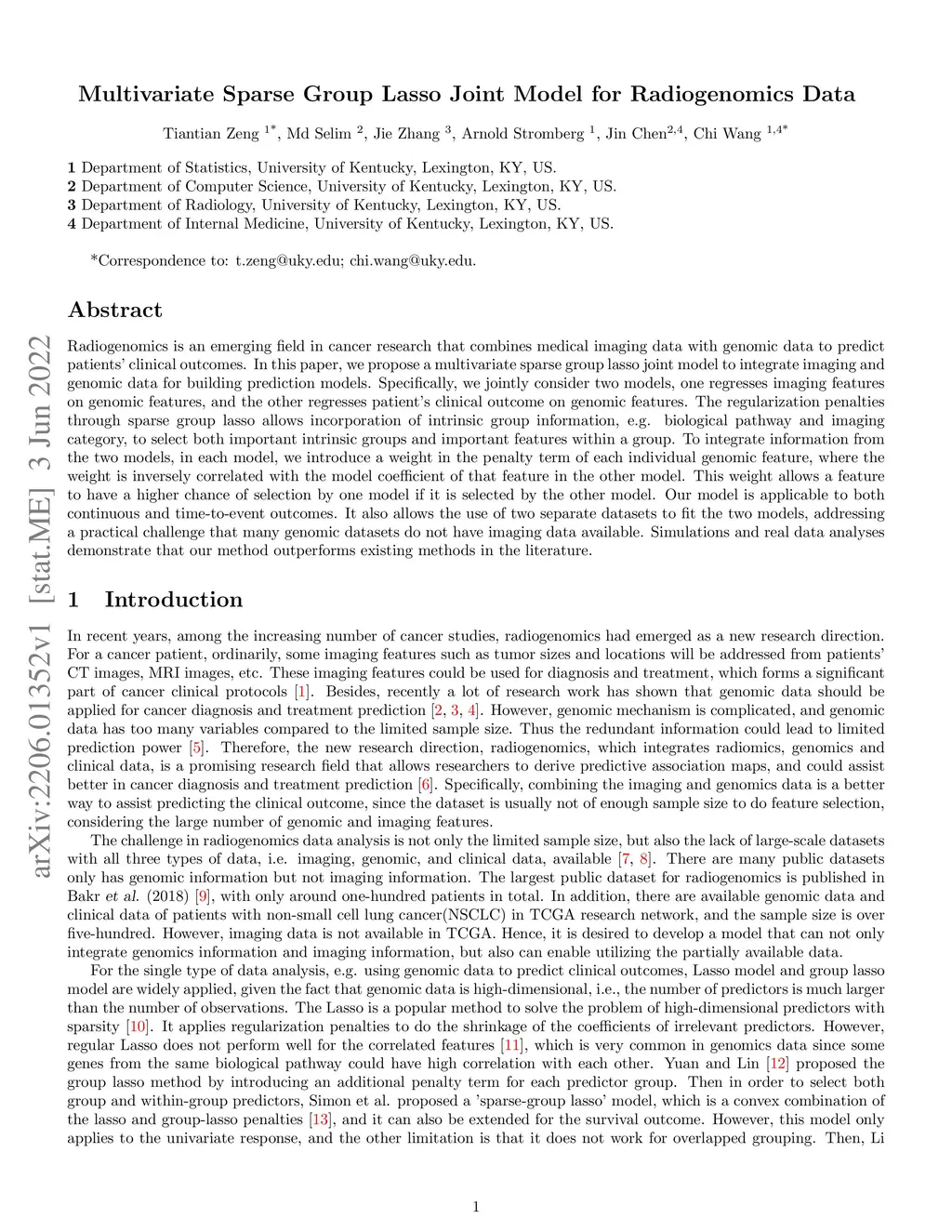 Multivariate Sparse Group Lasso Joint Model for Radiogenomics Data