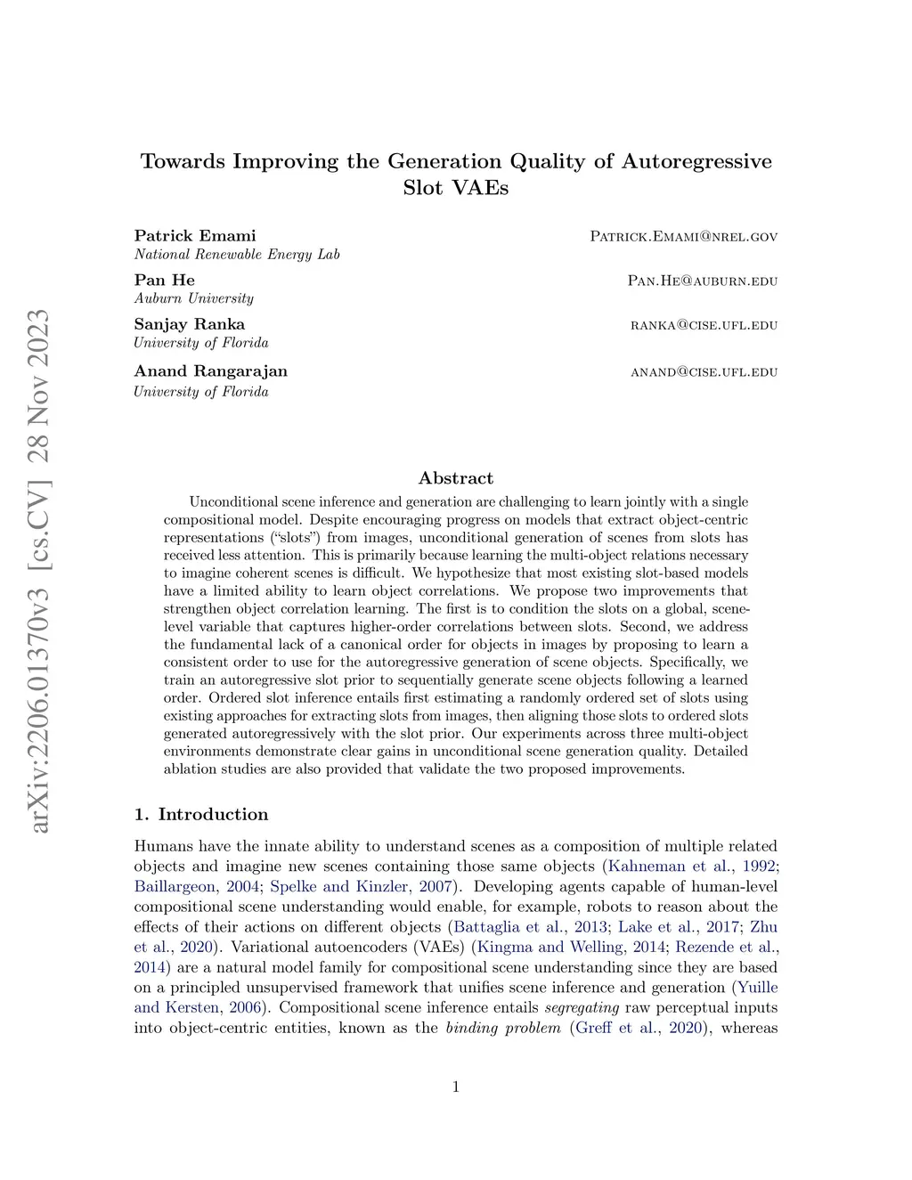 Unconditional scene inference and generation are challenging to learn jointly with a single compositional model. Despite encouraging progress on models that extract object-centric representations (''slots'') from images, unconditional generation of scenes from slots has received less attention. This is primarily because learning the multi-object relations necessary to imagine coherent scenes is difficult. We hypothesize that most existing slot-based models have a limited ability to learn object correlations. We propose two improvements that strengthen object correlation learning. The first is to condition the slots on a global, scene-level variable that captures higher-order correlations between slots. Second, we address the fundamental lack of a canonical order for objects in images by proposing to learn a consistent order to use for the autoregressive generation of scene objects. Specifically, we train an autoregressive slot prior to sequentially generate scene objects following a learned order. Ordered slot inference entails first estimating a randomly ordered set of slots using existing approaches for extracting slots from images, then aligning those slots to ordered slots generated autoregressively with the slot prior. Our experiments across three multi-object environments demonstrate clear gains in unconditional scene generation quality. Detailed ablation studies are also provided that validate the two proposed improvements.