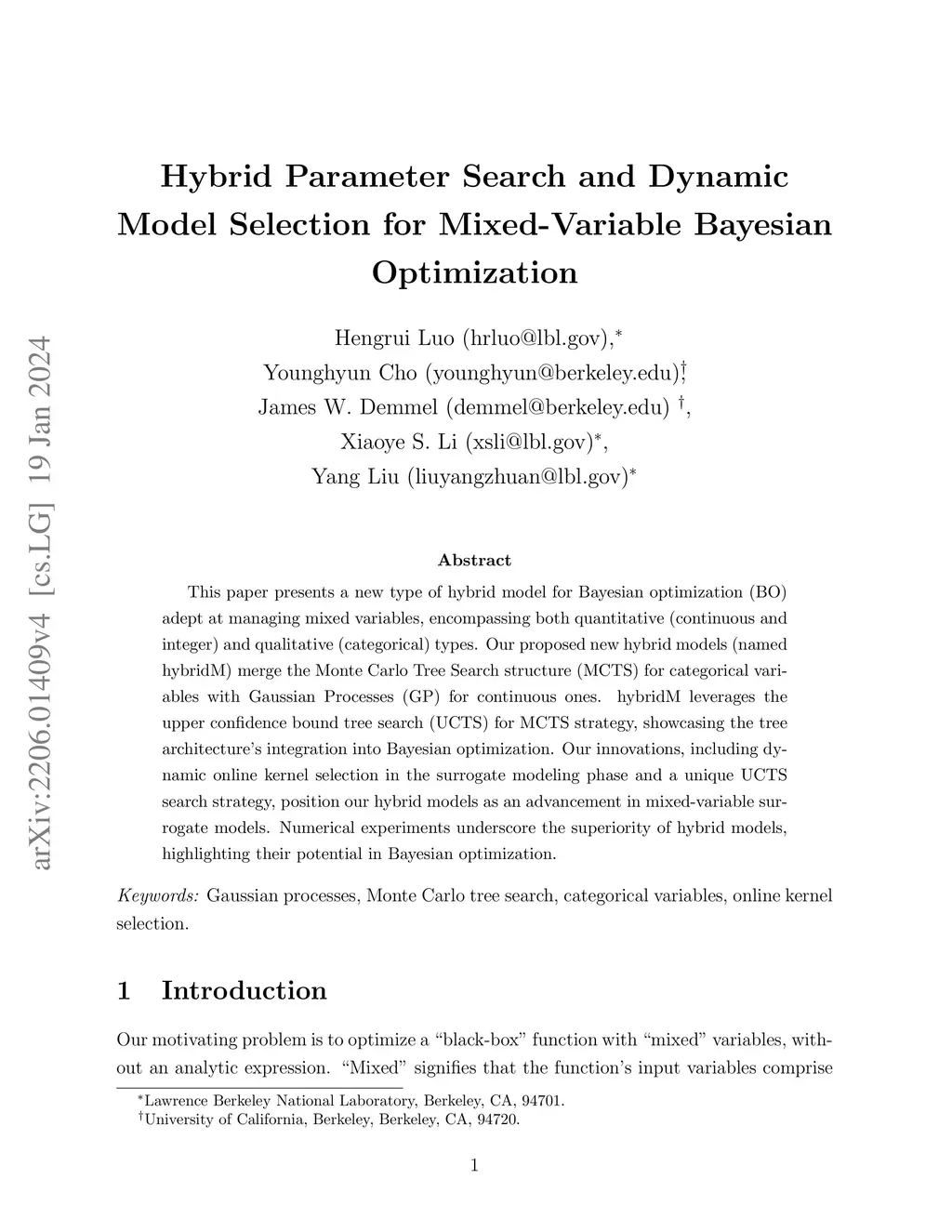 This paper presents a new type of hybrid model for Bayesian optimization (BO) adept at managing mixed variables, encompassing both quantitative (continuous and integer) and qualitative (categorical) types. Our proposed new hybrid models (named hybridM) merge the Monte Carlo Tree Search structure (MCTS) for categorical variables with Gaussian Processes (GP) for continuous ones. hybridM leverages the upper confidence bound tree search (UCTS) for MCTS strategy, showcasing the tree architecture's integration into Bayesian optimization. Our innovations, including dynamic online kernel selection in the surrogate modeling phase and a unique UCTS search strategy, position our hybrid models as an advancement in mixed-variable surrogate models. Numerical experiments underscore the superiority of hybrid models, highlighting their potential in Bayesian optimization.
