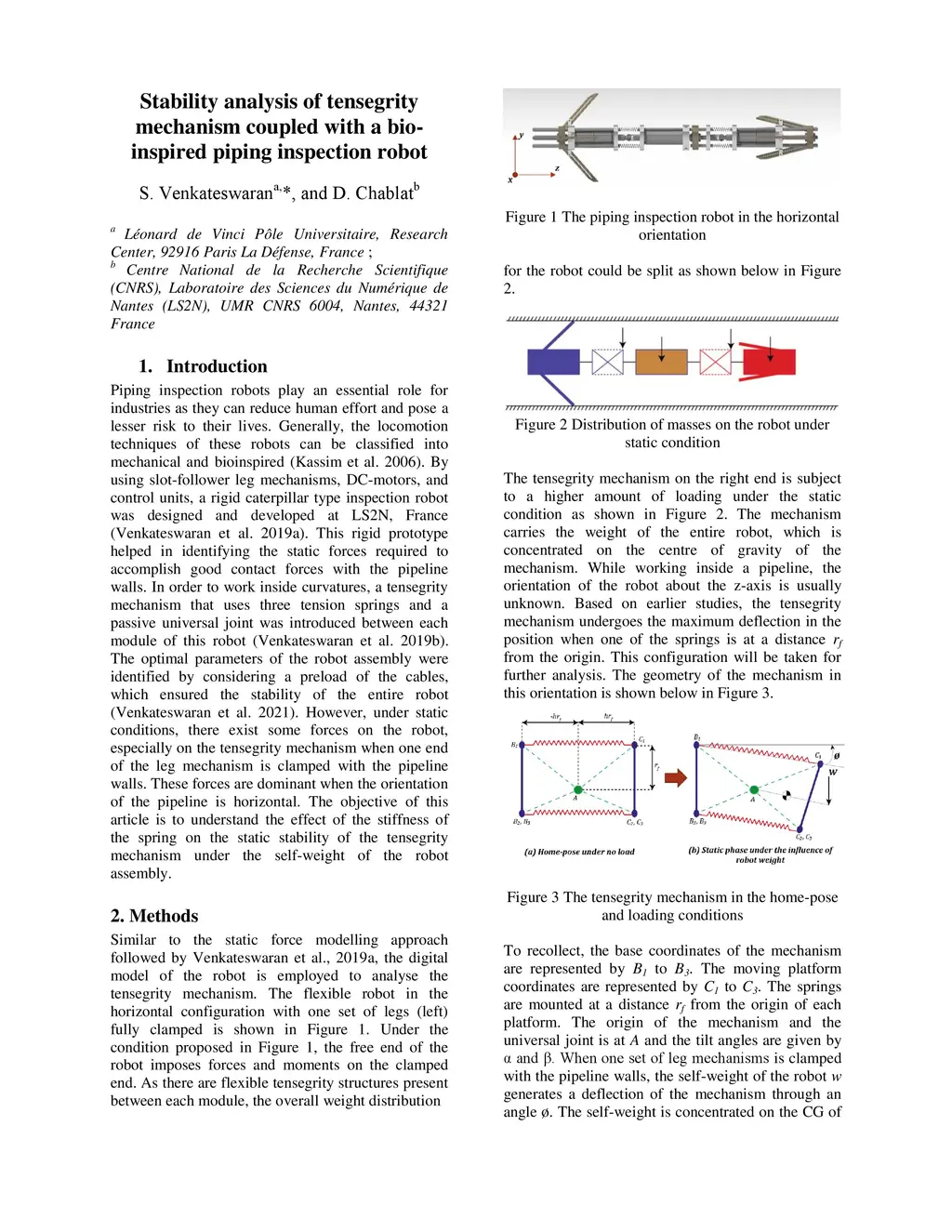 Piping inspection robots play an essential role for industries as they can reduce human effort and pose a lesser risk to their lives. Generally, the locomotion techniques of these robots can be classified into mechanical and bioinspired. By using slot-follower leg mechanisms, DC-motors, and control units, a rigid caterpillar type inspection robot was designed and developed at LS2N, France . This rigid prototype helped in identifying the static forces required to accomplish good contact forces with the pipeline walls. In order to work inside curvatures, a tensegrity mechanism that uses three tension springs and a passive universal joint was introduced between each module of this robot. The optimal parameters of the robot assembly were identified by considering a preload of the cables, which ensured the stability of the entire robot. However, under static conditions, there exist some forces on the robot, especially on the tensegrity mechanism when one end of the leg mechanism is clamped with the pipeline walls. These forces are dominant when the orientation of the pipeline is horizontal. The objective of this article is to understand the effect of the stiffness of the spring on the static stability of the tensegrity mechanism under the self-weight of the robot assembly.