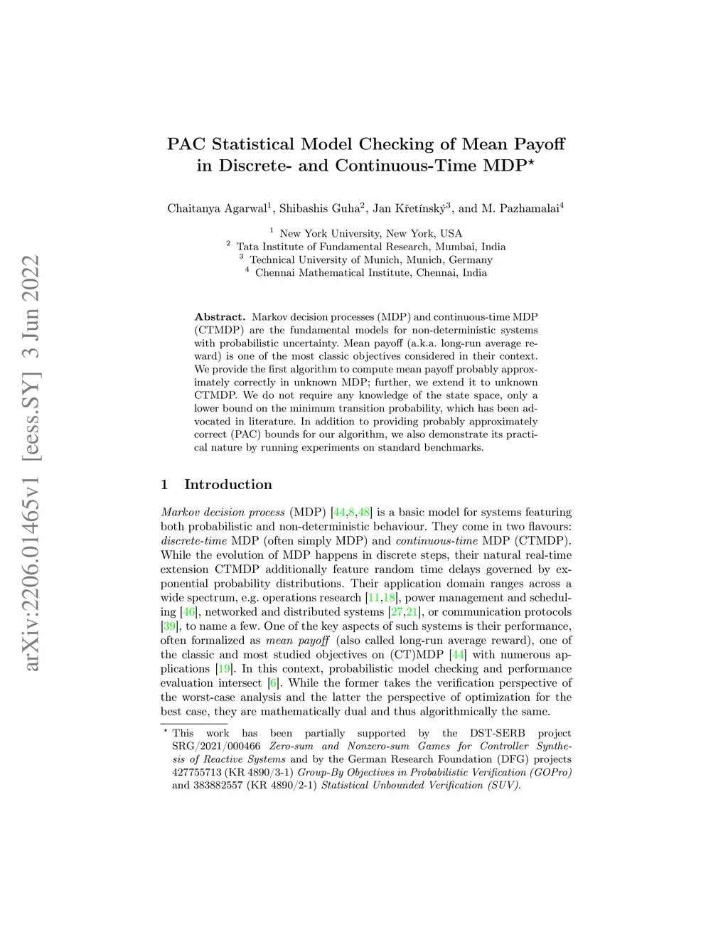 Markov decision processes (MDP) and continuous-time MDP (CTMDP) are the fundamental models for non-deterministic systems with probabilistic uncertainty. Mean payoff (a.k.a. long-run average reward) is one of the most classic objectives considered in their context. We provide the first algorithm to compute mean payoff probably approximately correctly in unknown MDP; further, we extend it to unknown CTMDP. We do not require any knowledge of the state space, only a lower bound on the minimum transition probability, which has been advocated in literature. In addition to providing probably approximately correct (PAC) bounds for our algorithm, we also demonstrate its practical nature by running experiments on standard benchmarks.