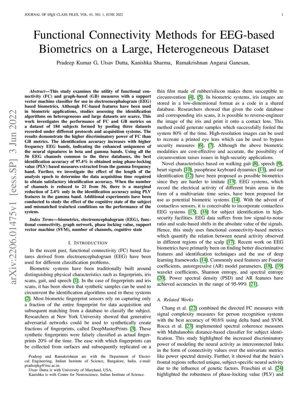 This study examines the utility of functional connectivity (FC) and graph-based (GB) measures with a support vector machine classifier for use in electroencephalogram (EEG) based biometrics. Although FC-based features have been used in biometric applications, studies assessing the identification algorithms on heterogeneous and large datasets are scarce. This work investigates the performance of FC and GB metrics on a dataset of 184 subjects formed by pooling three datasets recorded under different protocols and acquisition systems. The results demonstrate the higher discriminatory power of FC than GB metrics. The identification accuracy increases with higher frequency EEG bands, indicating the enhanced uniqueness of the neural signatures in beta and gamma bands. Using all the 56 EEG channels common to the three databases, the best identification accuracy of 97.4% is obtained using phase-locking value (PLV) based measures extracted from the gamma frequency band. Further, we investigate the effect of the length of the analysis epoch to determine the data acquisition time required to obtain satisfactory identification accuracy. When the number of channels is reduced to 21 from 56, there is a marginal reduction of 2.4% only in the identification accuracy using PLV features in the gamma band. Additional experiments have been conducted to study the effect of the cognitive state of the subject and mismatched train/test conditions on the performance of the system.