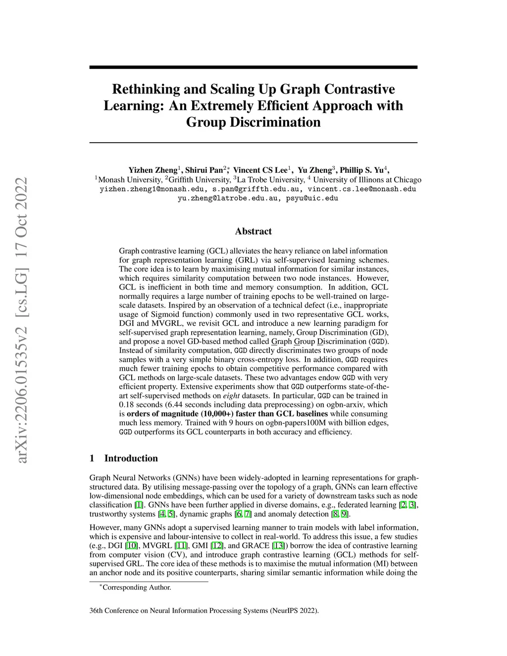 Graph contrastive learning (GCL) alleviates the heavy reliance on label information for graph representation learning (GRL) via self-supervised learning schemes. The core idea is to learn by maximising mutual information for similar instances, which requires similarity computation between two node instances. However, GCL is inefficient in both time and memory consumption. In addition, GCL normally requires a large number of training epochs to be well-trained on large-scale datasets. Inspired by an observation of a technical defect (i.e., inappropriate usage of Sigmoid function) commonly used in two representative GCL works, DGI and MVGRL, we revisit GCL and introduce a new learning paradigm for self-supervised graph representation learning, namely, Group Discrimination (GD), and propose a novel GD-based method called Graph Group Discrimination (GGD). Instead of similarity computation, GGD directly discriminates two groups of node samples with a very simple binary cross-entropy loss. In addition, GGD requires much fewer training epochs to obtain competitive performance compared with GCL methods on large-scale datasets. These two advantages endow GGD with very efficient property. Extensive experiments show that GGD outperforms state-of-the-art self-supervised methods on eight datasets. In particular, GGD can be trained in 0.18 seconds (6.44 seconds including data preprocessing) on ogbn-arxiv, which is orders of magnitude (10,000+) faster than GCL baselines while consuming much less memory. Trained with 9 hours on ogbn-papers100M with billion edges, GGD outperforms its GCL counterparts in both accuracy and efficiency.