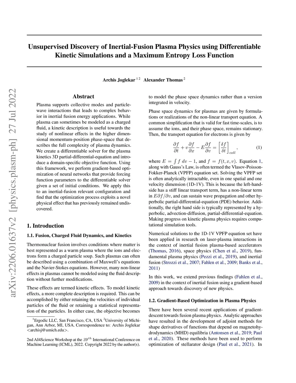Plasma supports collective modes and particle-wave interactions that leads to complex behavior in inertial fusion energy applications. While plasma can sometimes be modeled as a charged fluid, a kinetic description is useful towards the study of nonlinear effects in the higher dimensional momentum-position phase-space that describes the full complexity of plasma dynamics. We create a differentiable solver for the plasma kinetics 3D partial-differential-equation and introduce a domain-specific objective function. Using this framework, we perform gradient-based optimization of neural networks that provide forcing function parameters to the differentiable solver given a set of initial conditions. We apply this to an inertial-fusion relevant configuration and find that the optimization process exploits a novel physical effect that has previously remained undiscovered.