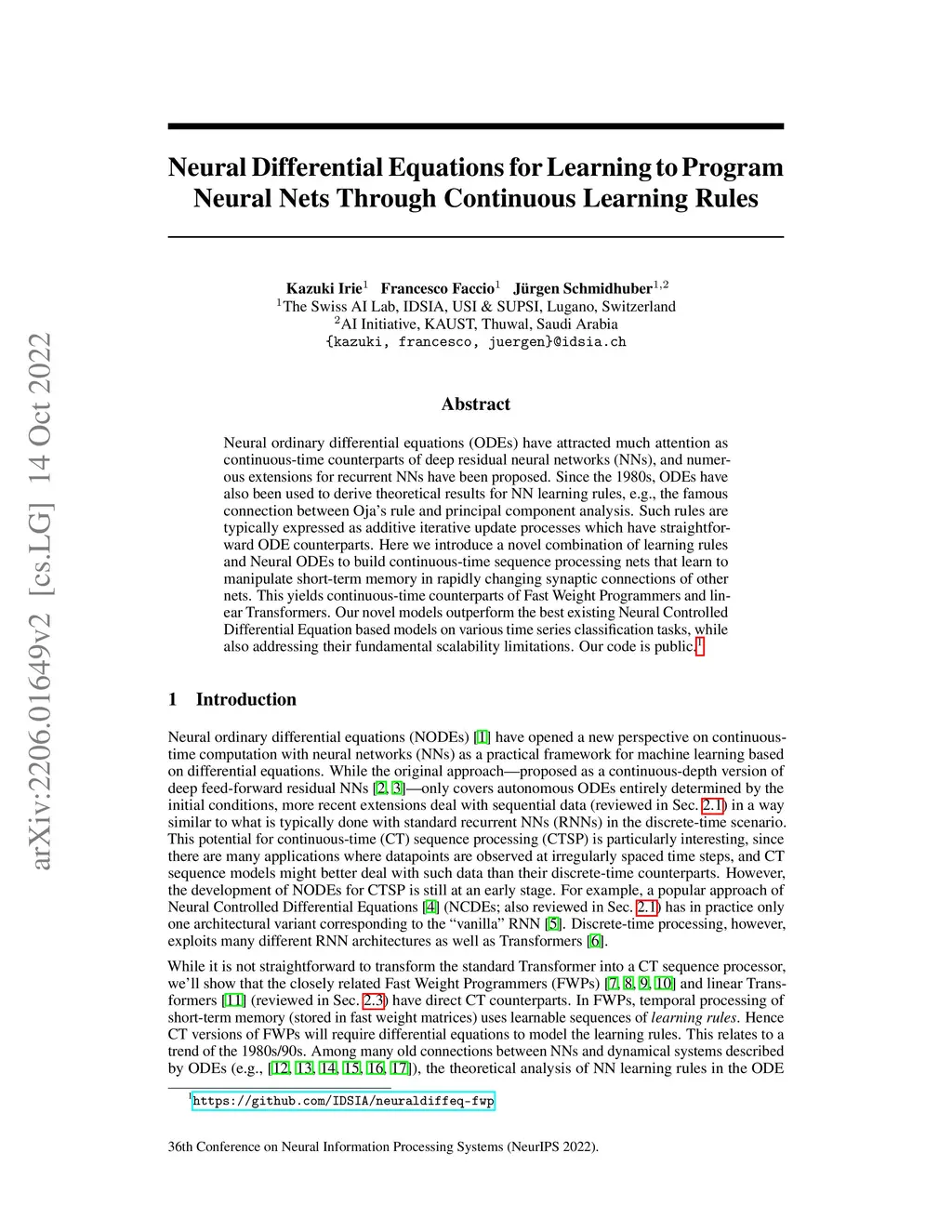 Neural ordinary differential equations (ODEs) have attracted much attention as continuous-time counterparts of deep residual neural networks (NNs), and numerous extensions for recurrent NNs have been proposed. Since the 1980s, ODEs have also been used to derive theoretical results for NN learning rules, e.g., the famous connection between Oja's rule and principal component analysis. Such rules are typically expressed as additive iterative update processes which have straightforward ODE counterparts. Here we introduce a novel combination of learning rules and Neural ODEs to build continuous-time sequence processing nets that learn to manipulate short-term memory in rapidly changing synaptic connections of other nets. This yields continuous-time counterparts of Fast Weight Programmers and linear Transformers. Our novel models outperform the best existing Neural Controlled Differential Equation based models on various time series classification tasks, while also addressing their fundamental scalability limitations. Our code is public.