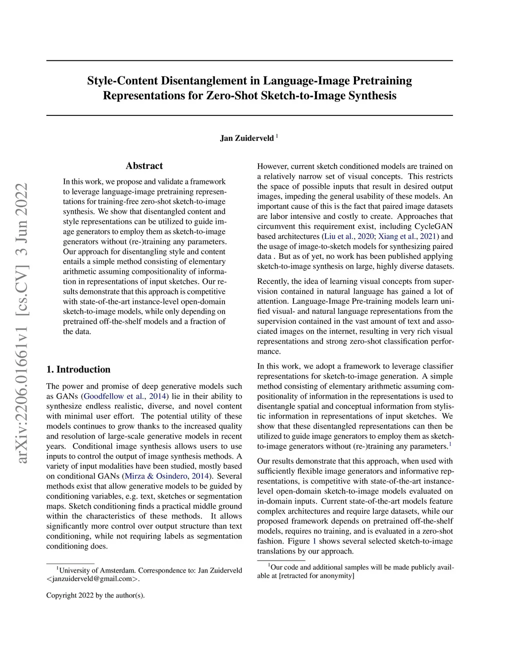 In this work, we propose and validate a framework to leverage language-image pretraining representations for training-free zero-shot sketch-to-image synthesis. We show that disentangled content and style representations can be utilized to guide image generators to employ them as sketch-to-image generators without (re-)training any parameters. Our approach for disentangling style and content entails a simple method consisting of elementary arithmetic assuming compositionality of information in representations of input sketches. Our results demonstrate that this approach is competitive with state-of-the-art instance-level open-domain sketch-to-image models, while only depending on pretrained off-the-shelf models and a fraction of the data.