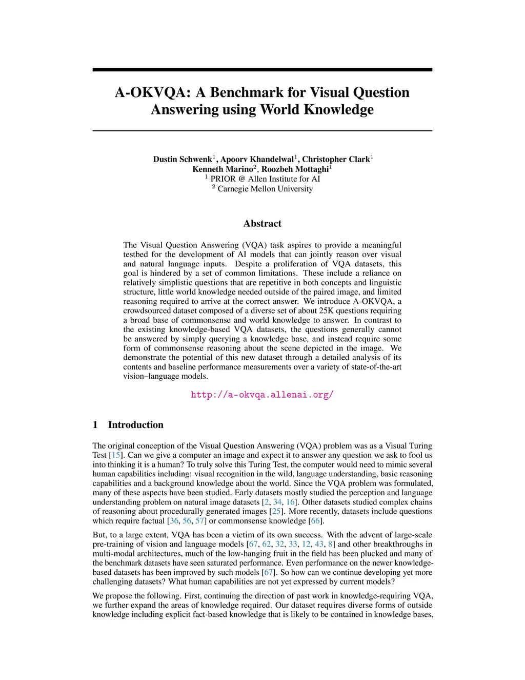 The Visual Question Answering (VQA) task aspires to provide a meaningful testbed for the development of AI models that can jointly reason over visual and natural language inputs. Despite a proliferation of VQA datasets, this goal is hindered by a set of common limitations. These include a reliance on relatively simplistic questions that are repetitive in both concepts and linguistic structure, little world knowledge needed outside of the paired image, and limited reasoning required to arrive at the correct answer. We introduce A-OKVQA, a crowdsourced dataset composed of a diverse set of about 25K questions requiring a broad base of commonsense and world knowledge to answer. In contrast to the existing knowledge-based VQA datasets, the questions generally cannot be answered by simply querying a knowledge base, and instead require some form of commonsense reasoning about the scene depicted in the image. We demonstrate the potential of this new dataset through a detailed analysis of its contents and baseline performance measurements over a variety of state-of-the-art vision-language models. Project page: http://a-okvqa.allenai.org/