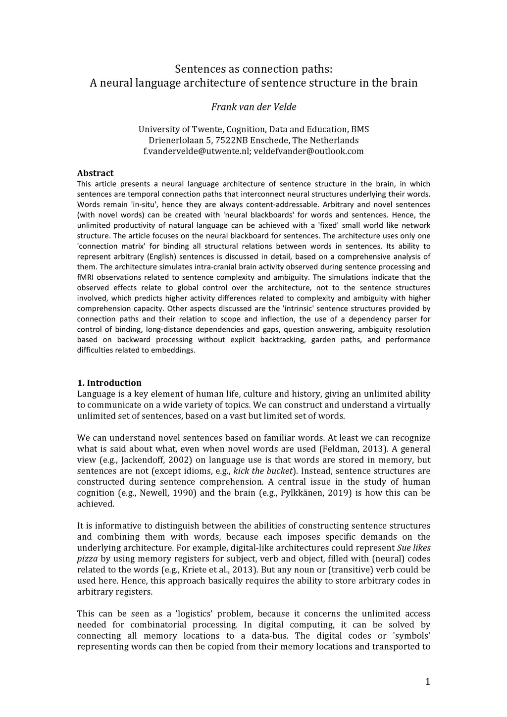 This article presents a neural language architecture of sentence structure in the brain, in which sentences are temporal connection paths that interconnect neural structures underlying their words. Words remain ín-situ', hence they are always content-addressable. Arbitrary and novel sentences (with novel words) can be created with ñeural blackboards' for words and sentences. Hence, the unlimited productivity of natural language can be achieved with a 'fixed' small world like network structure. The article focuses on the neural blackboard for sentences. The architecture uses only one 'connection matrix' for binding all structural relations between words in sentences. Its ability to represent arbitrary (English) sentences is discussed in detail, based on a comprehensive analysis of them. The architecture simulates intra-cranial brain activity observed during sentence processing and fMRI observations related to sentence complexity and ambiguity. The simulations indicate that the observed effects relate to global control over the architecture, not to the sentence structures involved, which predicts higher activity differences related to complexity and ambiguity with higher comprehension capacity. Other aspects discussed are the íntrinsic' sentence structures provided by connection paths and their relation to scope and inflection, the use of a dependency parser for control of binding, long-distance dependencies and gaps, question answering, ambiguity resolution based on backward processing without explicit backtracking, garden paths, and performance difficulties related to embeddings.