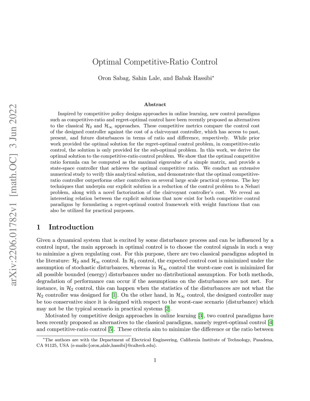Inspired by competitive policy designs approaches in online learning, new control paradigms such as competitive-ratio and regret-optimal control have been recently proposed as alternatives to the classical and approaches. These competitive metrics compare the control cost of the designed controller against the cost of a clairvoyant controller, which has access to past, present, and future disturbances in terms of ratio and difference, respectively. While prior work provided the optimal solution for the regret-optimal control problem, in competitive-ratio control, the solution is only provided for the sub-optimal problem. In this work, we derive the optimal solution to the competitive-ratio control problem. We show that the optimal competitive ratio formula can be computed as the maximal eigenvalue of a simple matrix, and provide a state-space controller that achieves the optimal competitive ratio. We conduct an extensive numerical study to verify this analytical solution, and demonstrate that the optimal competitive-ratio controller outperforms other controllers on several large scale practical systems. The key techniques that underpin our explicit solution is a reduction of the control problem to a Nehari problem, along with a novel factorization of the clairvoyant controller's cost. We reveal an interesting relation between the explicit solutions that now exist for both competitive control paradigms by formulating a regret-optimal control framework with weight functions that can also be utilized for practical purposes.
