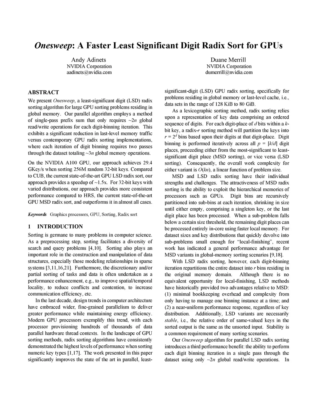 Onesweep: A Faster Least Significant Digit Radix Sort for GPUs