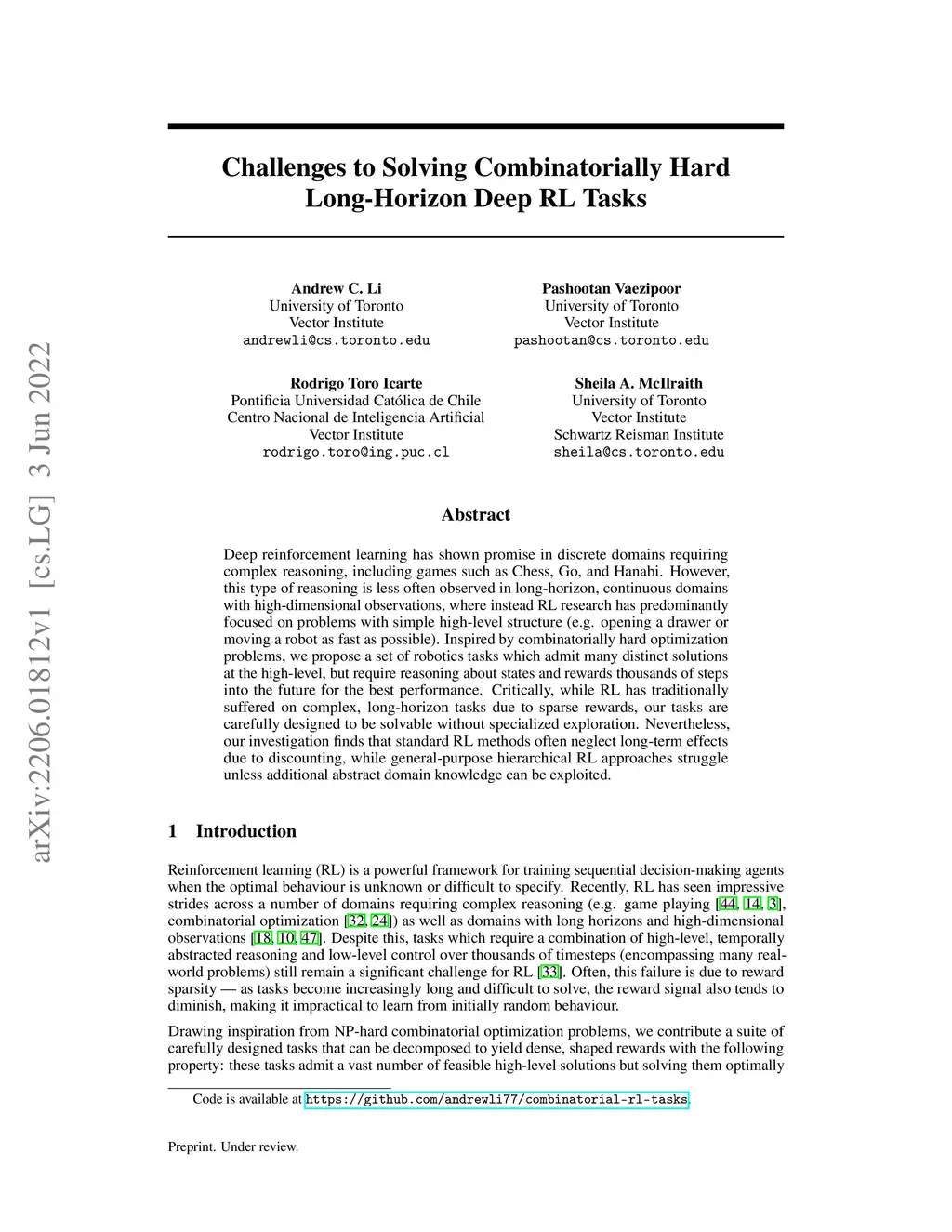 Deep reinforcement learning has shown promise in discrete domains requiring complex reasoning, including games such as Chess, Go, and Hanabi. However, this type of reasoning is less often observed in long-horizon, continuous domains with high-dimensional observations, where instead RL research has predominantly focused on problems with simple high-level structure (e.g. opening a drawer or moving a robot as fast as possible). Inspired by combinatorially hard optimization problems, we propose a set of robotics tasks which admit many distinct solutions at the high-level, but require reasoning about states and rewards thousands of steps into the future for the best performance. Critically, while RL has traditionally suffered on complex, long-horizon tasks due to sparse rewards, our tasks are carefully designed to be solvable without specialized exploration. Nevertheless, our investigation finds that standard RL methods often neglect long-term effects due to discounting, while general-purpose hierarchical RL approaches struggle unless additional abstract domain knowledge can be exploited.