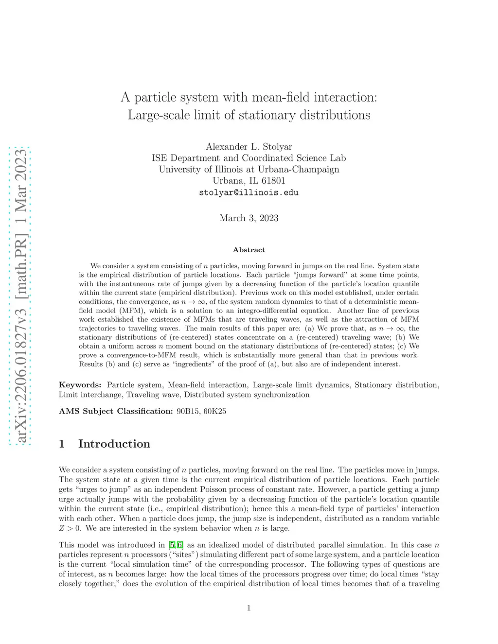 We consider a system consisting of particles, moving forward in jumps on the real line. System state is the empirical distribution of particle locations. Each particle ``jumps forward'' at some time points, with the instantaneous rate of jumps given by a decreasing function of the particle's location quantile within the current state (empirical distribution). Previous work on this model established, under certain conditions, the convergence, as , of the system random dynamics to that of a deterministic mean-field model (MFM), which is a solution to an integro-differential equation. Another line of previous work established the existence of MFMs that are traveling waves, as well as the attraction of MFM trajectories to traveling waves. The main results of this paper are: (a) We prove that, as , the stationary distributions of (re-centered) states concentrate on a (re-centered) traveling wave; (b) We obtain a uniform across moment bound on the stationary distributions of (re-centered) states; (c) We prove a convergence-to-MFM result, which is substantially more general than that in previous work. Results (b) and (c) serve as ``ingredients'' of the proof of (a), but also are of independent interest.