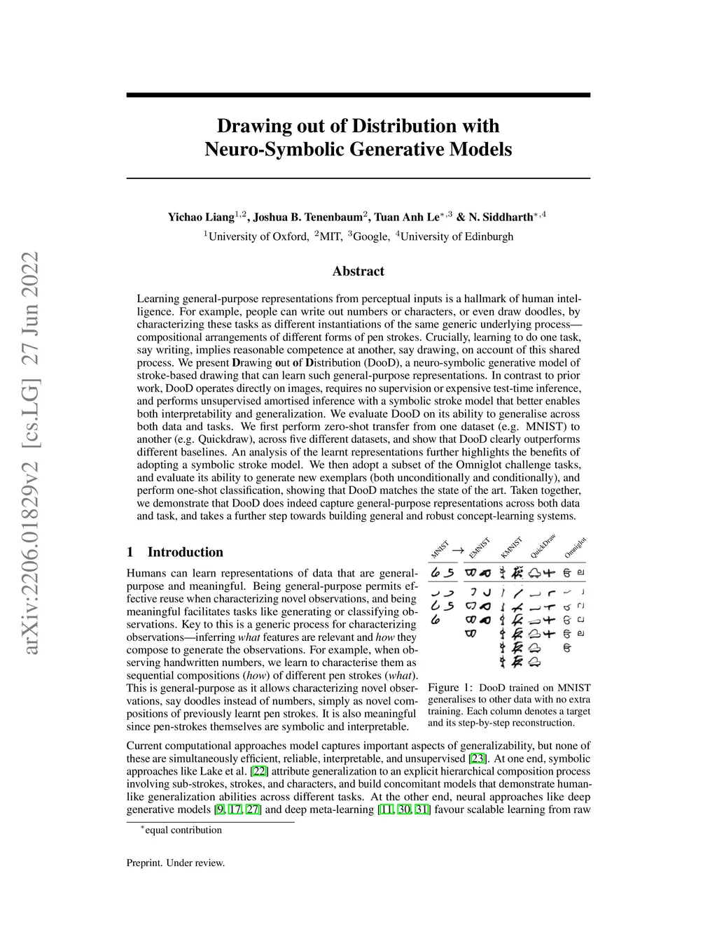 Learning general-purpose representations from perceptual inputs is a hallmark of human intelligence. For example, people can write out numbers or characters, or even draw doodles, by characterizing these tasks as different instantiations of the same generic underlying process -- compositional arrangements of different forms of pen strokes. Crucially, learning to do one task, say writing, implies reasonable competence at another, say drawing, on account of this shared process. We present Drawing out of Distribution (DooD), a neuro-symbolic generative model of stroke-based drawing that can learn such general-purpose representations. In contrast to prior work, DooD operates directly on images, requires no supervision or expensive test-time inference, and performs unsupervised amortised inference with a symbolic stroke model that better enables both interpretability and generalization. We evaluate DooD on its ability to generalise across both data and tasks. We first perform zero-shot transfer from one dataset (e.g. MNIST) to another (e.g. Quickdraw), across five different datasets, and show that DooD clearly outperforms different baselines. An analysis of the learnt representations further highlights the benefits of adopting a symbolic stroke model. We then adopt a subset of the Omniglot challenge tasks, and evaluate its ability to generate new exemplars (both unconditionally and conditionally), and perform one-shot classification, showing that DooD matches the state of the art. Taken together, we demonstrate that DooD does indeed capture general-purpose representations across both data and task, and takes a further step towards building general and robust concept-learning systems.