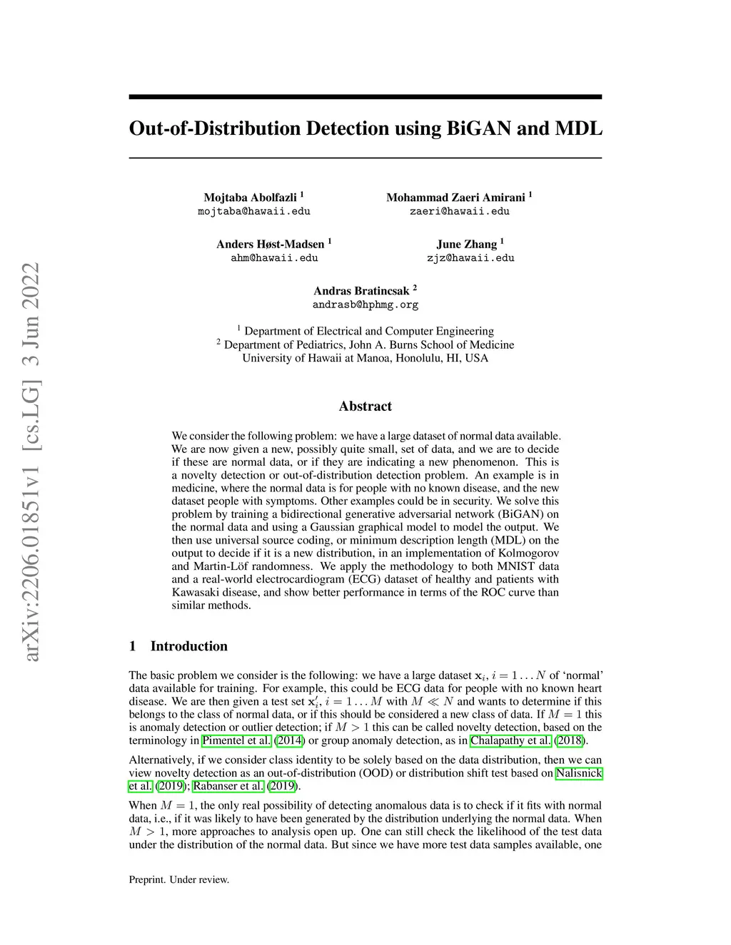We consider the following problem: we have a large dataset of normal data available. We are now given a new, possibly quite small, set of data, and we are to decide if these are normal data, or if they are indicating a new phenomenon. This is a novelty detection or out-of-distribution detection problem. An example is in medicine, where the normal data is for people with no known disease, and the new dataset people with symptoms. Other examples could be in security. We solve this problem by training a bidirectional generative adversarial network (BiGAN) on the normal data and using a Gaussian graphical model to model the output. We then use universal source coding, or minimum description length (MDL) on the output to decide if it is a new distribution, in an implementation of Kolmogorov and Martin-L\"{o}f randomness. We apply the methodology to both MNIST data and a real-world electrocardiogram (ECG) dataset of healthy and patients with Kawasaki disease, and show better performance in terms of the ROC curve than similar methods.