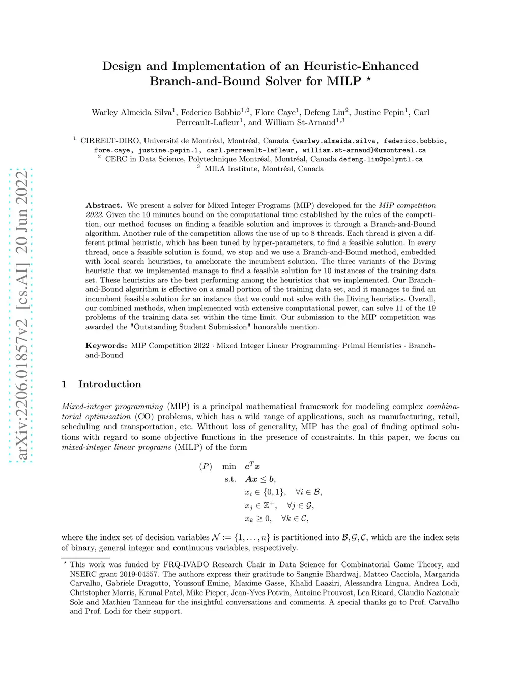 We present a solver for Mixed Integer Programs (MIP) developed for the MIP competition 2022. Given the 10 minutes bound on the computational time established by the rules of the competition, our method focuses on finding a feasible solution and improves it through a Branch-and-Bound algorithm. Another rule of the competition allows the use of up to 8 threads. Each thread is given a different primal heuristic, which has been tuned by hyper-parameters, to find a feasible solution. In every thread, once a feasible solution is found, we stop and we use a Branch-and-Bound method, embedded with local search heuristics, to ameliorate the incumbent solution. The three variants of the Diving heuristic that we implemented manage to find a feasible solution for 10 instances of the training data set. These heuristics are the best performing among the heuristics that we implemented. Our Branch-and-Bound algorithm is effective on a small portion of the training data set, and it manages to find an incumbent feasible solution for an instance that we could not solve with the Diving heuristics. Overall, our combined methods, when implemented with extensive computational power, can solve 11 of the 19 problems of the training data set within the time limit. Our submission to the MIP competition was awarded the "Outstanding Student Submission" honorable mention.