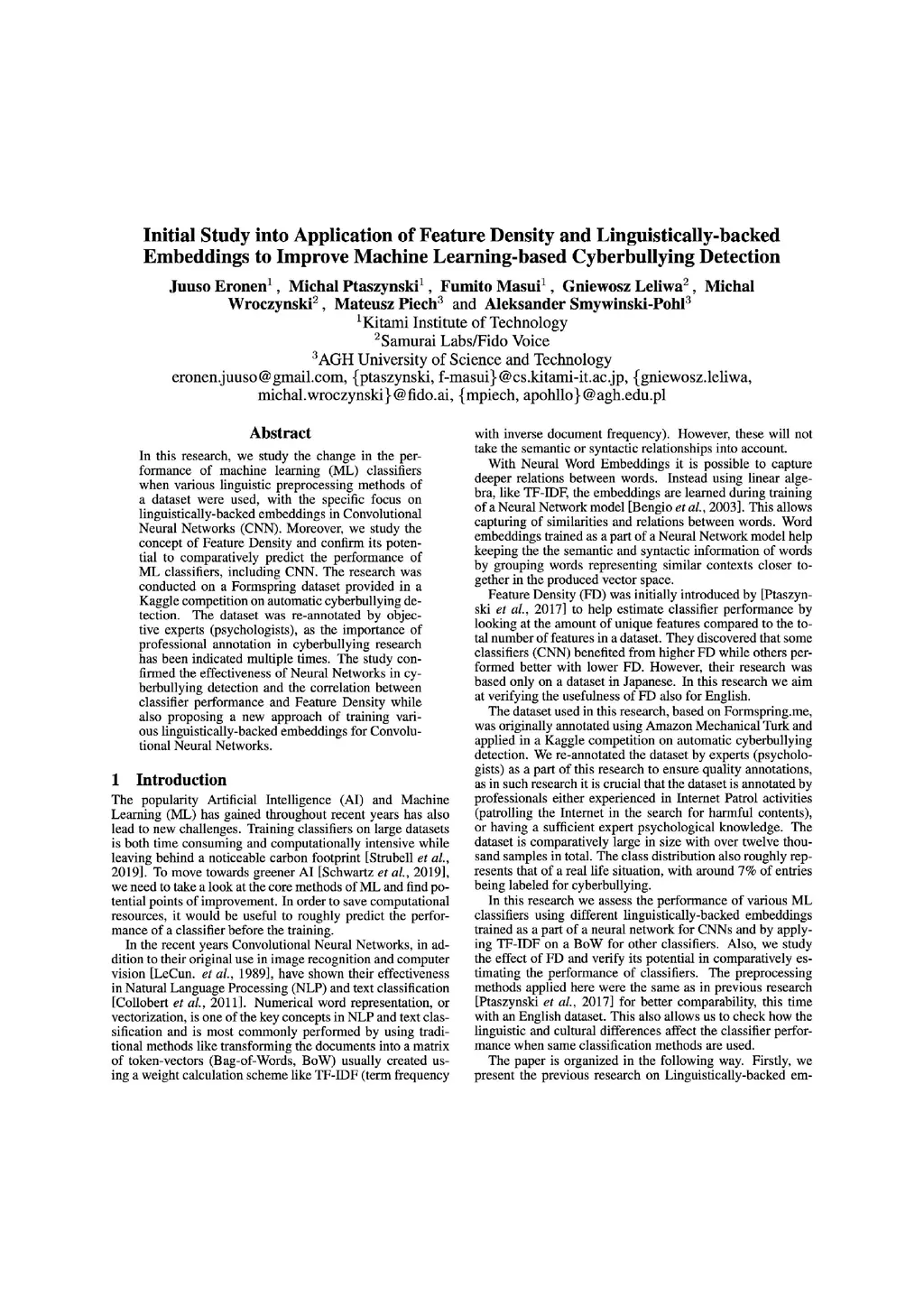 In this research, we study the change in the performance of machine learning (ML) classifiers when various linguistic preprocessing methods of a dataset were used, with the specific focus on linguistically-backed embeddings in Convolutional Neural Networks (CNN). Moreover, we study the concept of Feature Density and confirm its potential to comparatively predict the performance of ML classifiers, including CNN. The research was conducted on a Formspring dataset provided in a Kaggle competition on automatic cyberbullying detection. The dataset was re-annotated by objective experts (psychologists), as the importance of professional annotation in cyberbullying research has been indicated multiple times. The study confirmed the effectiveness of Neural Networks in cyberbullying detection and the correlation between classifier performance and Feature Density while also proposing a new approach of training various linguistically-backed embeddings for Convolutional Neural Networks.