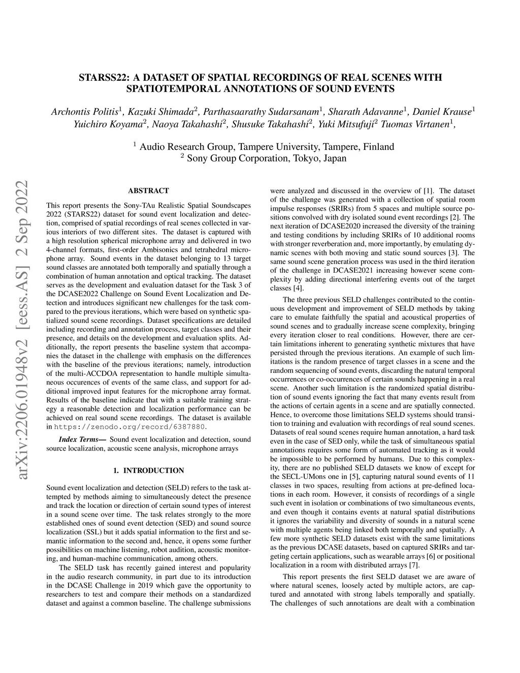 This report presents the Sony-TAu Realistic Spatial Soundscapes 2022 (STARS22) dataset for sound event localization and detection, comprised of spatial recordings of real scenes collected in various interiors of two different sites. The dataset is captured with a high resolution spherical microphone array and delivered in two 4-channel formats, first-order Ambisonics and tetrahedral microphone array. Sound events in the dataset belonging to 13 target sound classes are annotated both temporally and spatially through a combination of human annotation and optical tracking. The dataset serves as the development and evaluation dataset for the Task 3 of the DCASE2022 Challenge on Sound Event Localization and Detection and introduces significant new challenges for the task compared to the previous iterations, which were based on synthetic spatialized sound scene recordings. Dataset specifications are detailed including recording and annotation process, target classes and their presence, and details on the development and evaluation splits. Additionally, the report presents the baseline system that accompanies the dataset in the challenge with emphasis on the differences with the baseline of the previous iterations; namely, introduction of the multi-ACCDOA representation to handle multiple simultaneous occurences of events of the same class, and support for additional improved input features for the microphone array format. Results of the baseline indicate that with a suitable training strategy a reasonable detection and localization performance can be achieved on real sound scene recordings. The dataset is available in https://zenodo.org/record/6387880.