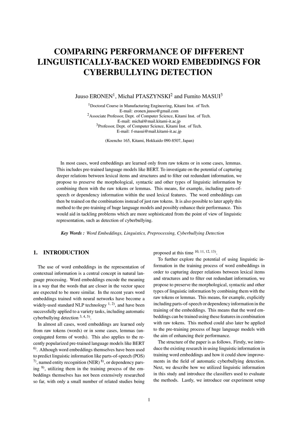 In most cases, word embeddings are learned only from raw tokens or in some cases, lemmas. This includes pre-trained language models like BERT. To investigate on the potential of capturing deeper relations between lexical items and structures and to filter out redundant information, we propose to preserve the morphological, syntactic and other types of linguistic information by combining them with the raw tokens or lemmas. This means, for example, including parts-of-speech or dependency information within the used lexical features. The word embeddings can then be trained on the combinations instead of just raw tokens. It is also possible to later apply this method to the pre-training of huge language models and possibly enhance their performance. This would aid in tackling problems which are more sophisticated from the point of view of linguistic representation, such as detection of cyberbullying.