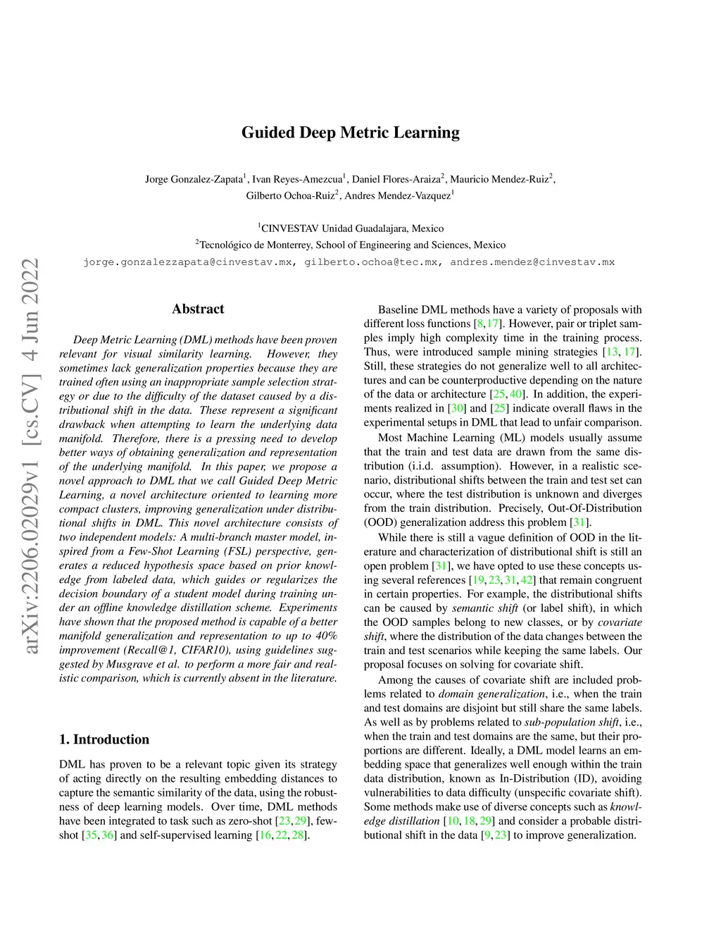 Deep Metric Learning (DML) methods have been proven relevant for visual similarity learning. However, they sometimes lack generalization properties because they are trained often using an inappropriate sample selection strategy or due to the difficulty of the dataset caused by a distributional shift in the data. These represent a significant drawback when attempting to learn the underlying data manifold. Therefore, there is a pressing need to develop better ways of obtaining generalization and representation of the underlying manifold. In this paper, we propose a novel approach to DML that we call Guided Deep Metric Learning, a novel architecture oriented to learning more compact clusters, improving generalization under distributional shifts in DML. This novel architecture consists of two independent models: A multi-branch master model, inspired from a Few-Shot Learning (FSL) perspective, generates a reduced hypothesis space based on prior knowledge from labeled data, which guides or regularizes the decision boundary of a student model during training under an offline knowledge distillation scheme. Experiments have shown that the proposed method is capable of a better manifold generalization and representation to up to 40% improvement (Recall@1, CIFAR10), using guidelines suggested by Musgrave et al. to perform a more fair and realistic comparison, which is currently absent in the literature